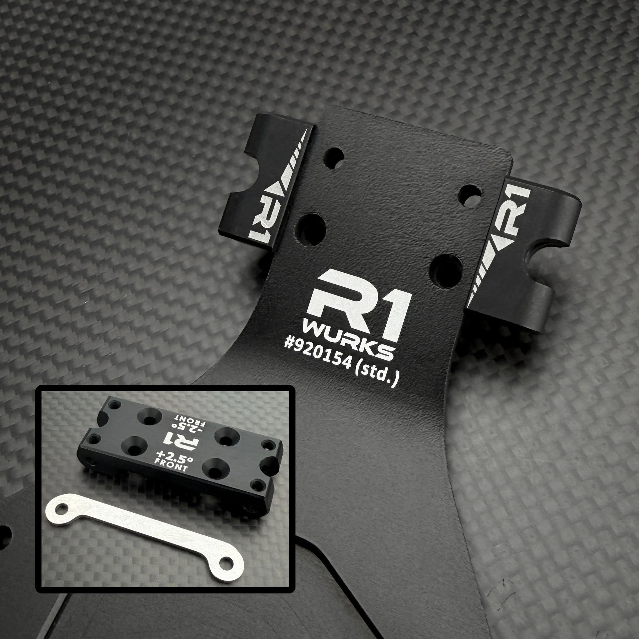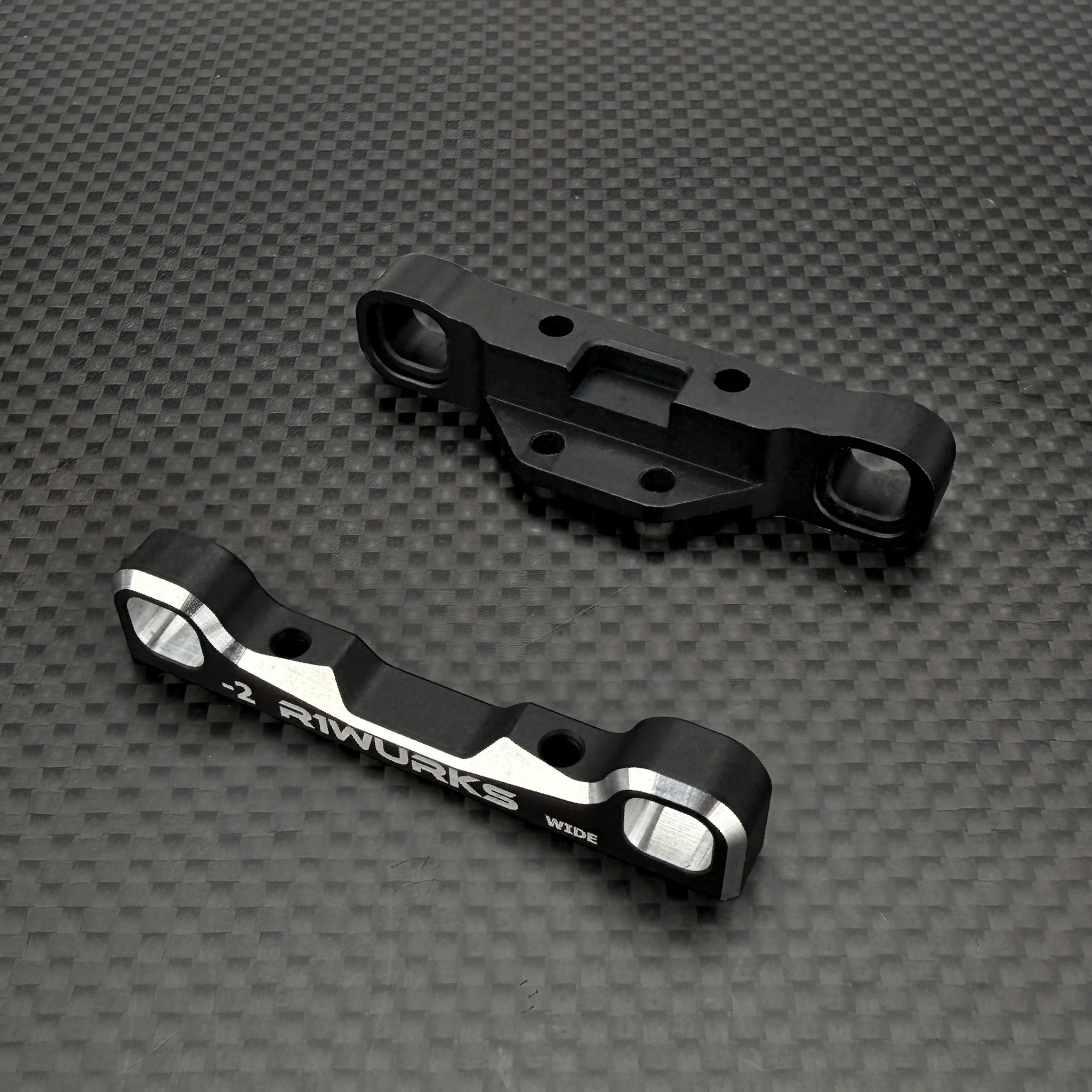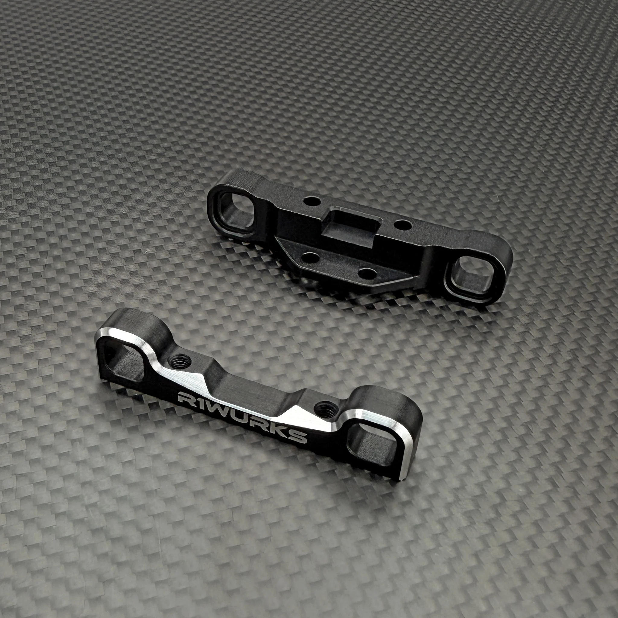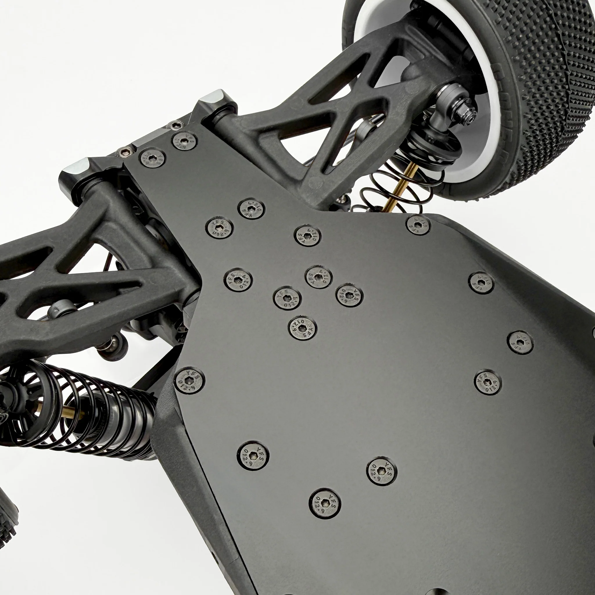 - Main chassis: 7075-T6 aluminum, black hard-anodized, strength-optimized with front taper that shifts flex forward, giving sharper steering and more precise handling.