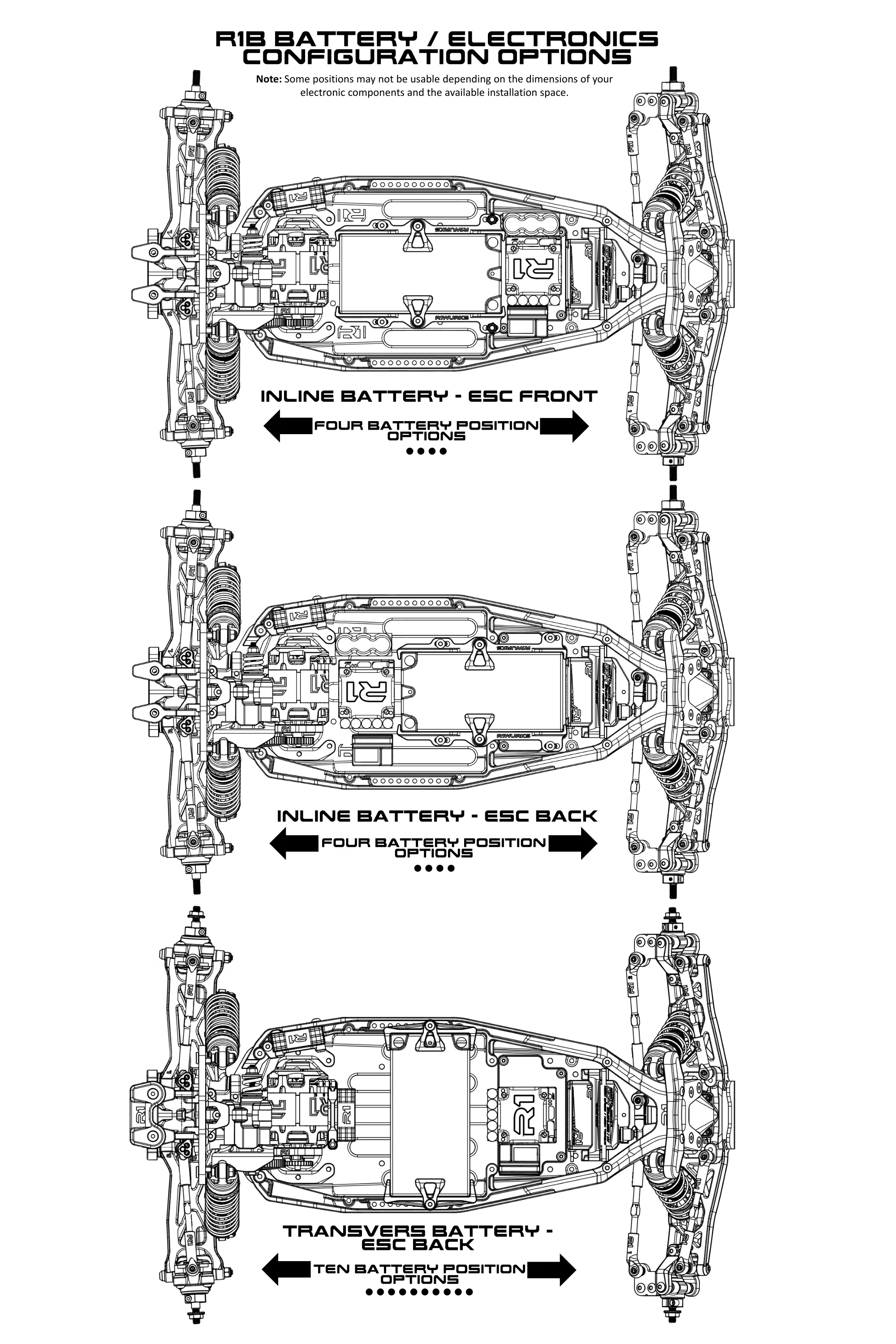 Battery mounting options: This kit is designed to accommodate either the standard transverse battery layout, which offers ten possible position settings, or an inline configuration. With the inline setup, you have the added flexibility of mounting the battery forward with the ESC behind, or at the back with the ESC in front. In addition to these options, there are four extra positions for further fine-tuning of weight placement.