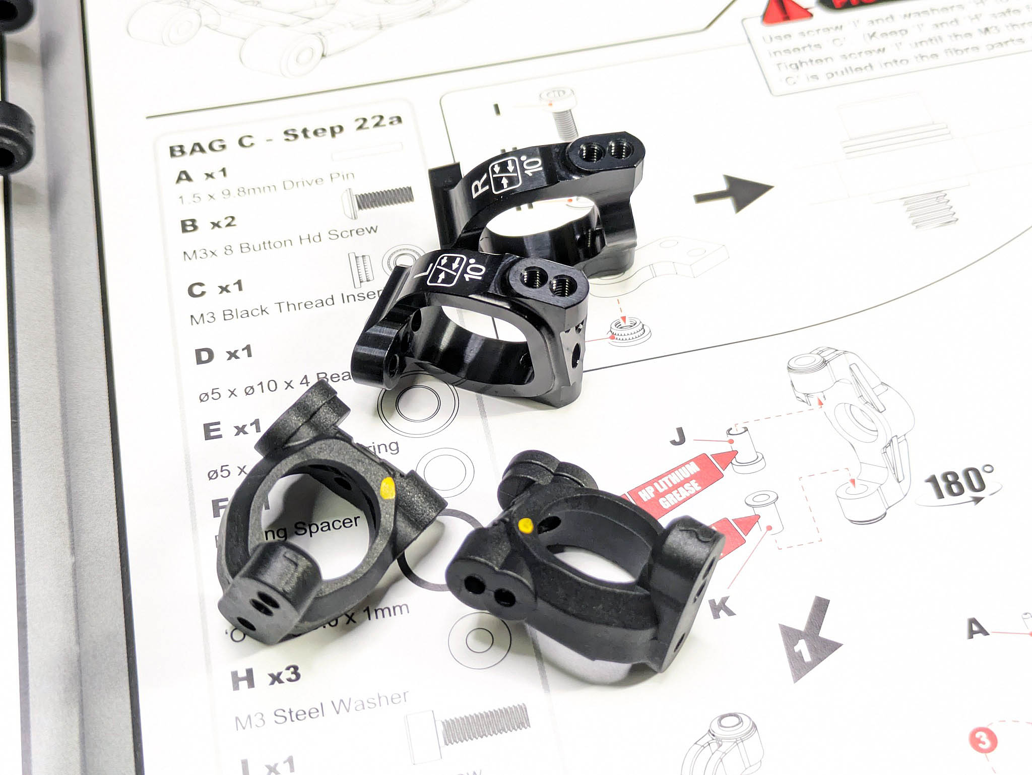We took the opportunity to add just a couple of option parts from the long list of available choices. The one-piece alloy servo mount, and the alloy front castor blocks both made the list, along with a tuning package of anti-roll bars and the latest "Agile" spring range from Schumacher house brand, Aerox. More on those later too.