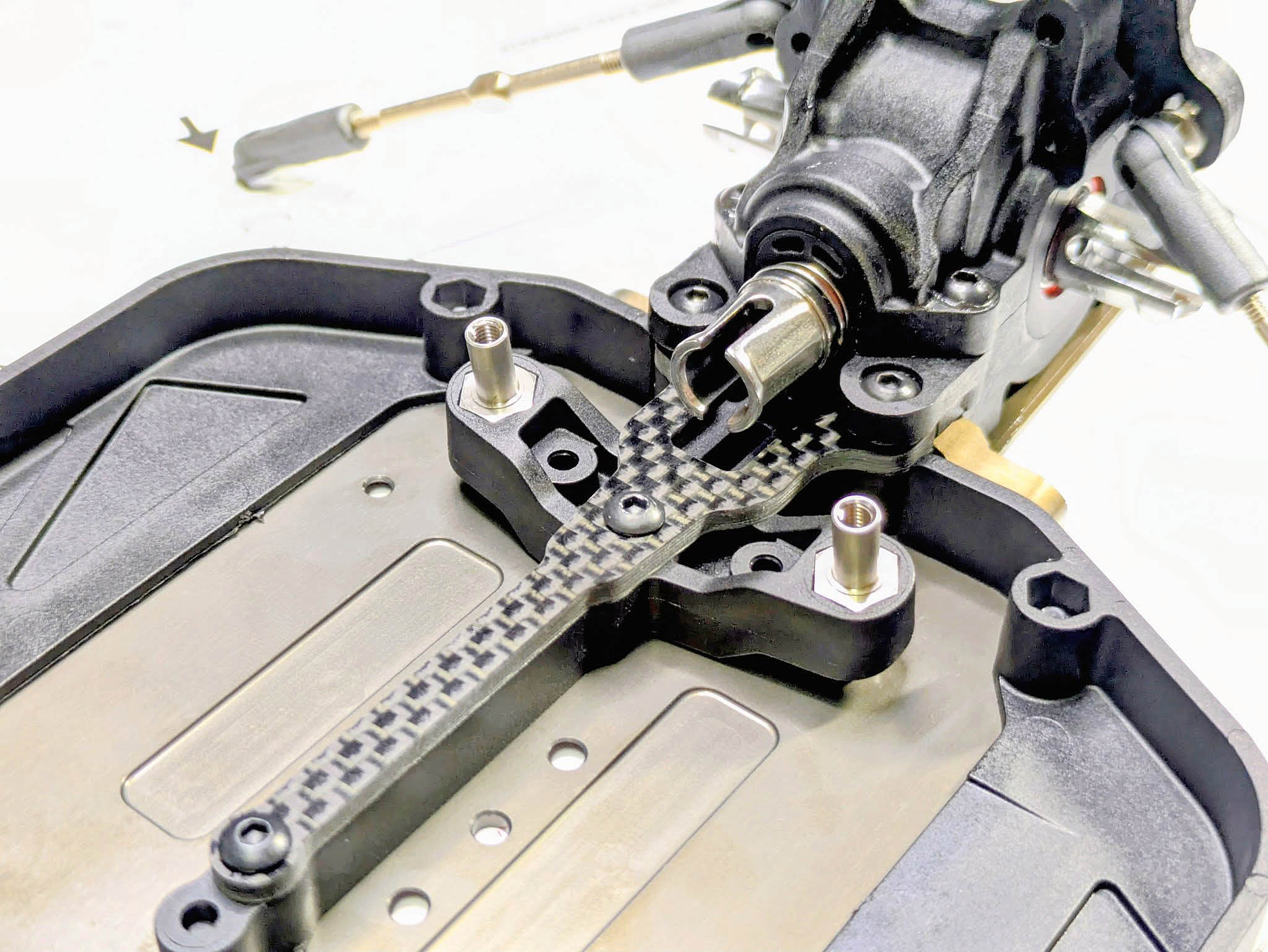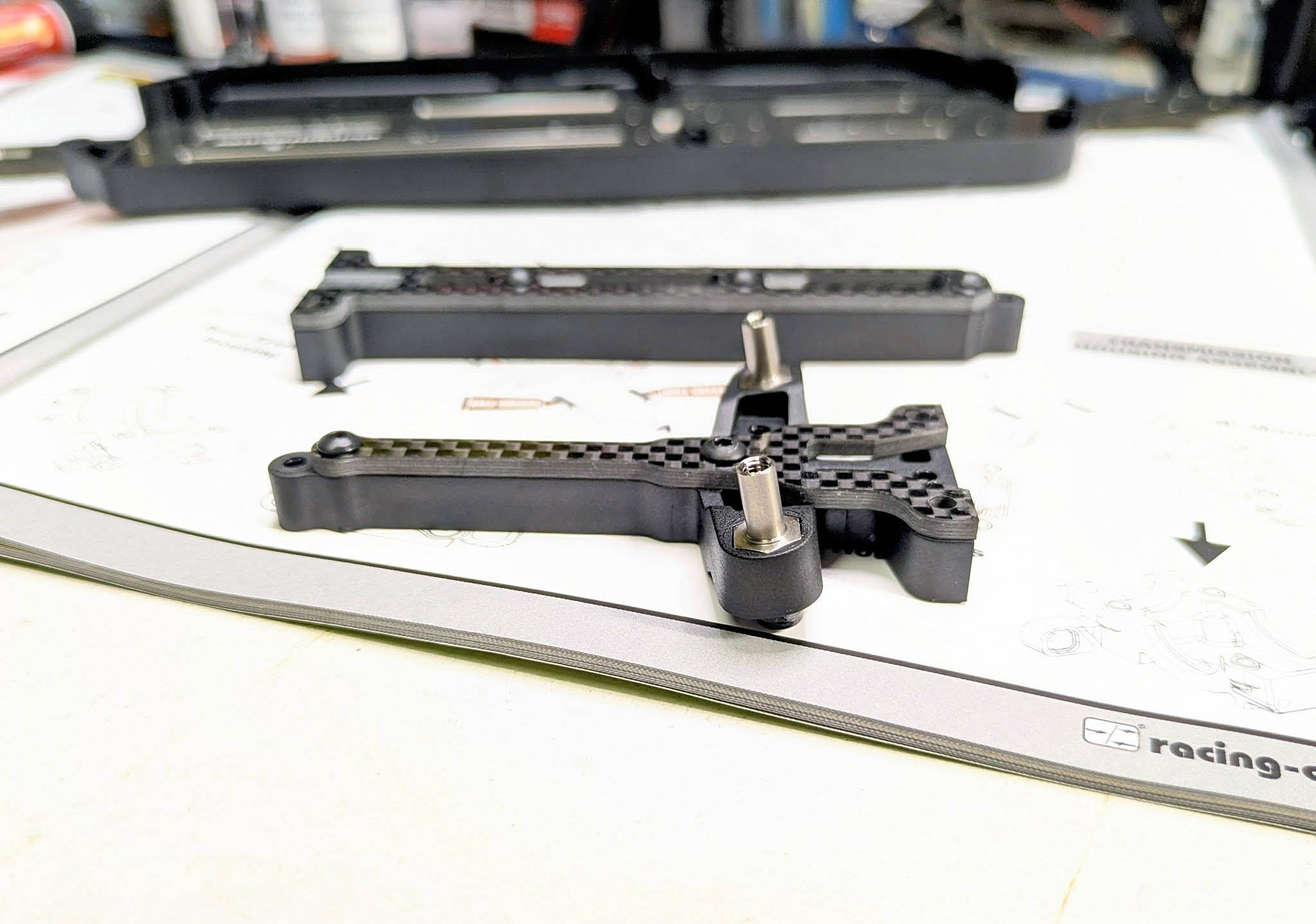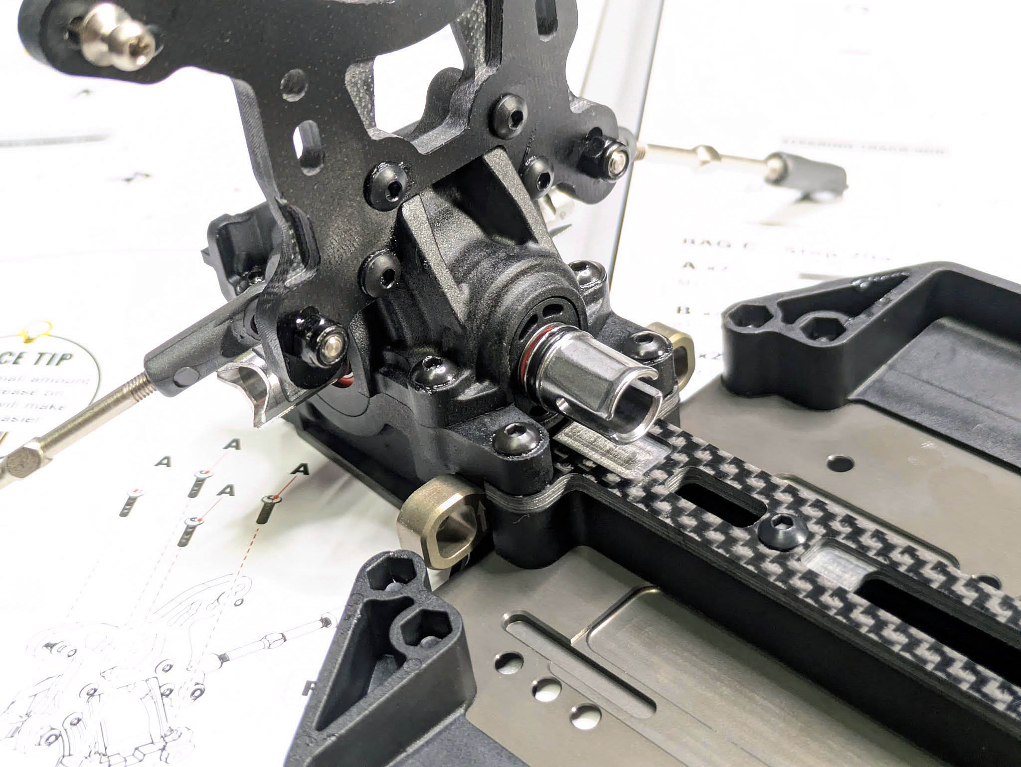One tip I picked up from a friend that proved helpful was in mounting the carbon radio tray. The manual calls for a threaded insert to be glued into the tray, which I did, but found it helpful to also add a dot of superglue and attach the small plastic spacer that holds the tray off the alloy chassis. On first assembly I left that spacer separate and juggled it all together, but later went back and glued it to the underside of the tray - making life much easier for the future.