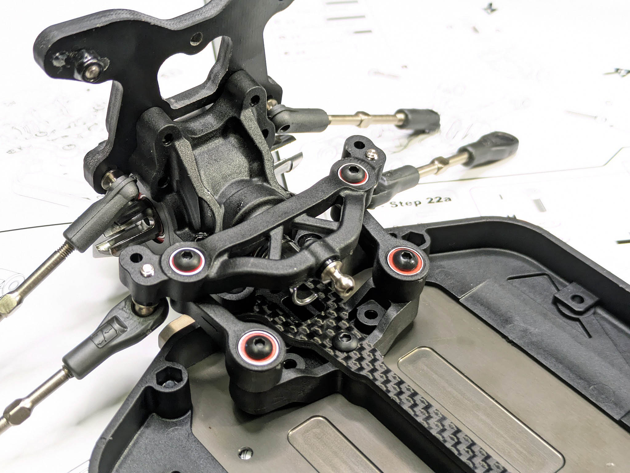 What did I particularly notice? The steering assembly is beautiful, and I'm intrigued by the approach Schumacher has taken in angling the steering posts back to match the front chassis kickup, rather than the more typical approach of setting them vertically. I also appreciate the full pill-adjustable suspension geometry in the all-alloy A/B/C/D arm mounts, and the ability to play with flex using different combinations of screws and (optional) stiffeners in the central spine of the chassis.