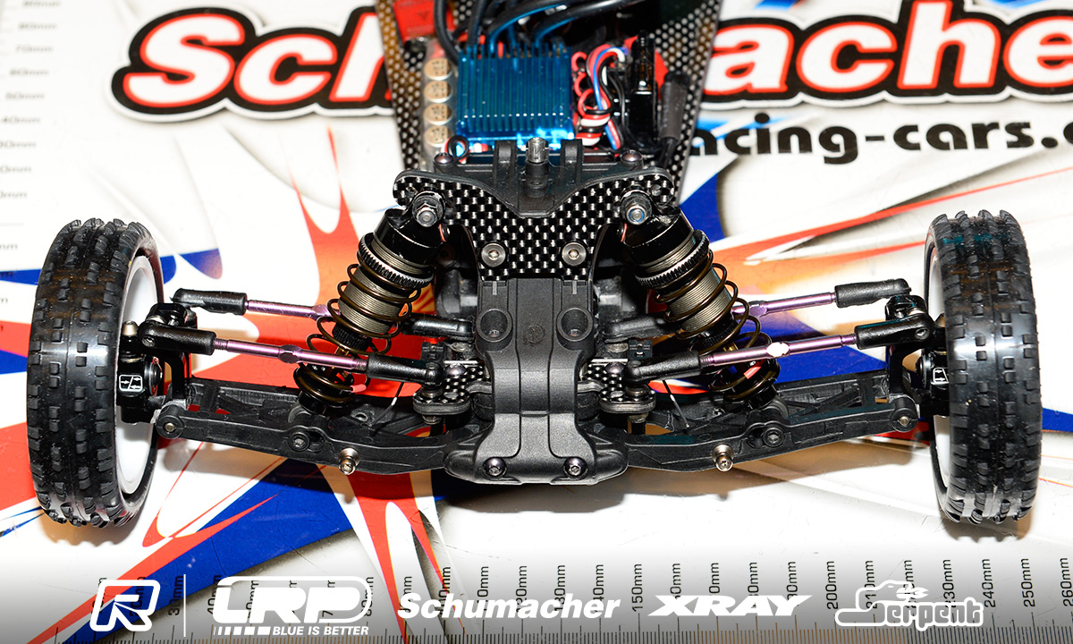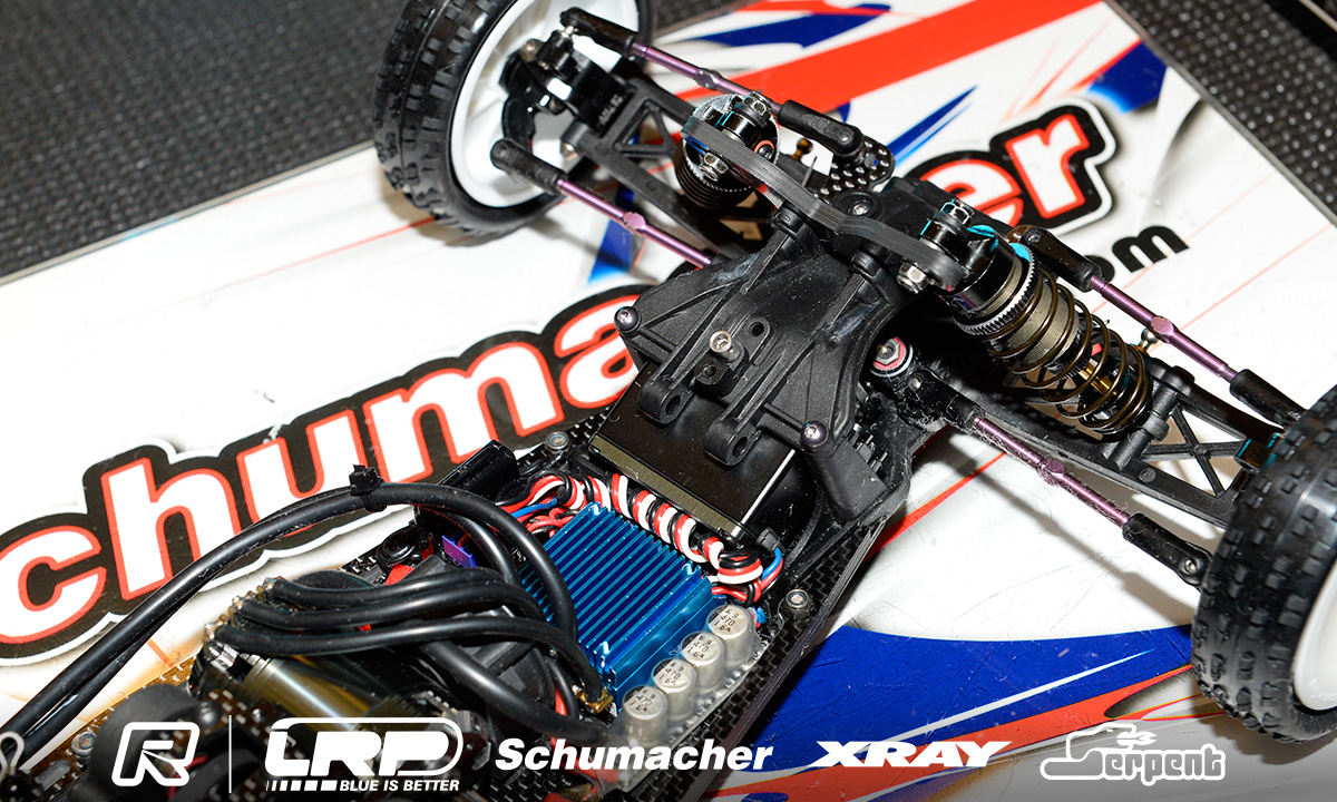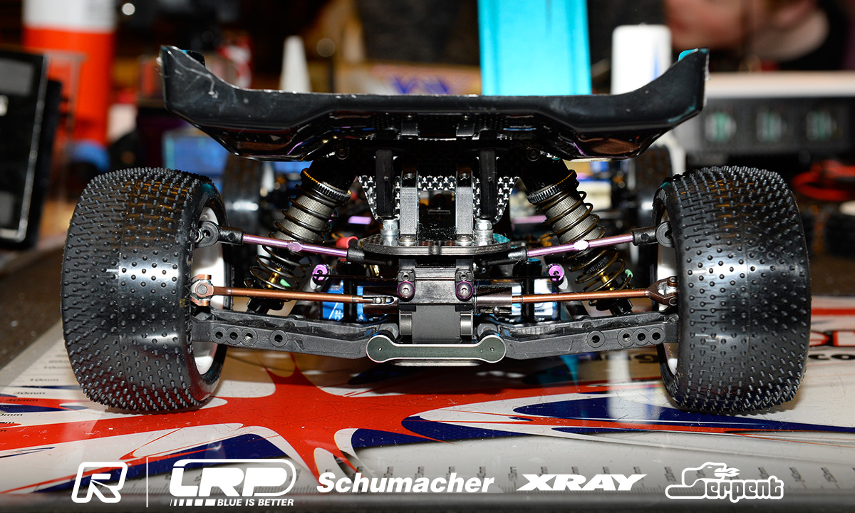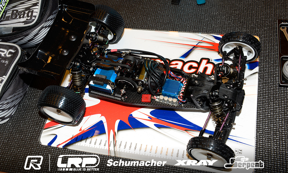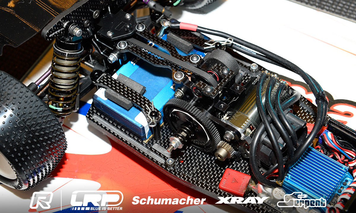 Remarks – Reigning DHI Champion Michal Orlowski is running a very interesting version of the Cougar KF2 which features a number of prototype parts conceived and realised by his engineer Tristram Neal. First and most important is a 3-gear transmission, that allows for an opposite motor spin direction for a better gyroscopic effect. The chassis flex is now adjusted by two carbon side stiffeners that work together with a new split top deck, so as to take stiffness away from the top of the car. The rear shock tower now features new holes towards the inside of the vehicle. Michal is also using a under-LiPo brass weight. |