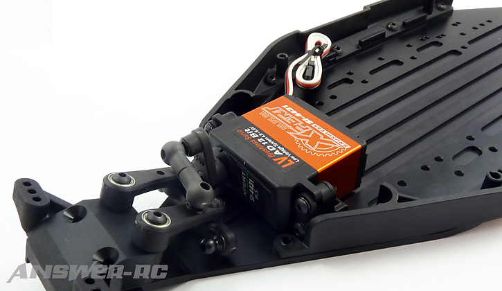 Next up is servo installation, we went with the Xpert SI-4431 full size servo rather than a low profile as it seems speaking to others running 2wd though the theory is nice that a lighter low profile servo allows you to add weight as you wish it ends up being the case that the weight is always fitted so there is no benefit to low profile for this installation. The Xpert SI-4431 is pretty much ideal for 10th buggyists out there with 17.5kg of torque and a transit time of just 0.08 seconds for 60degree movement. They centre well, are brushless and pretty much bullet proof in 1/10th. We thought we knew better than the manual at this point (wrong!) and initially fitted the servos with the rubber grommets we always use in 1/8th (not needed in 10th but we like to be cautious) only to find that it caused fitment issues with the front brace / upper deck so back to the manual we went used the included fitting parts which were perfect. We opted to use the larger of the two servo shims behind the servo but this will depend on your servo of choice and allows you to get the link as inline as possible with the steering bell crank.