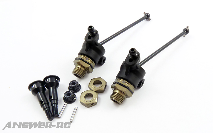 We now move onto the extremities of the car working firstly on the front hubs which are pretty conventional and feature a 12mm hex with a 4mm threaded shaft for the wheel to locate on so use of any 1/10th front wheels does not cause problem. These build up simply and easily, feature vertical ball studs for height adjustment and adjustable inserts. What is noticeable here is just how well the parts are all moulded and fit together. One other point of note is that the hinge pin used in both the steering pivot and the connection to the lower are the same pins which make keeping spares easy for those deciding which bits they may need in their spares box (SW-330536)