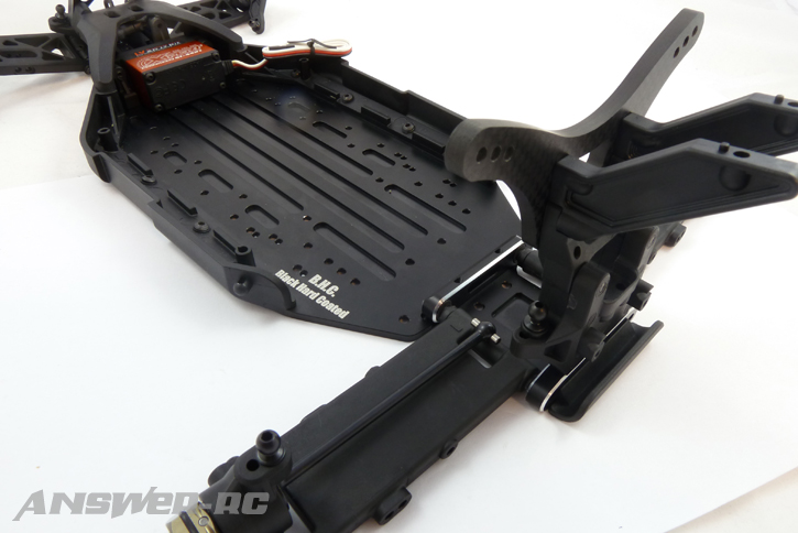 The next stage is to source and assemble all the steering components. This proves to be a very straightforward process with all parts fitting well, nice fluid smooth steering and a chance to see the front kick up adjustment. The front hingepin holder has two settings depending which way it is mounted allowing for 25degree and 30degree kick up out of the box, also included are two shims of 0.5mm and 1.0mm which allow the height of the plate to be adjusted. We built using 25degree and 0.5mm shim as per the set up used by Scott Yang at the recent 1/10th worlds out at the Yatabe arena Japan.