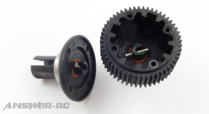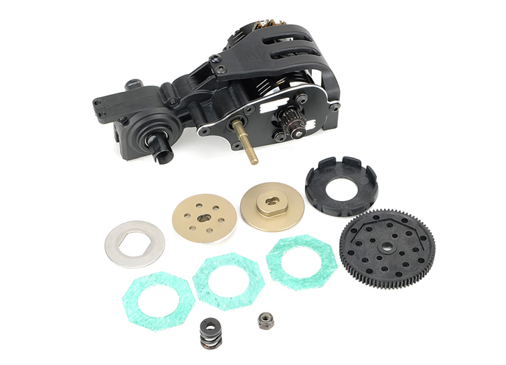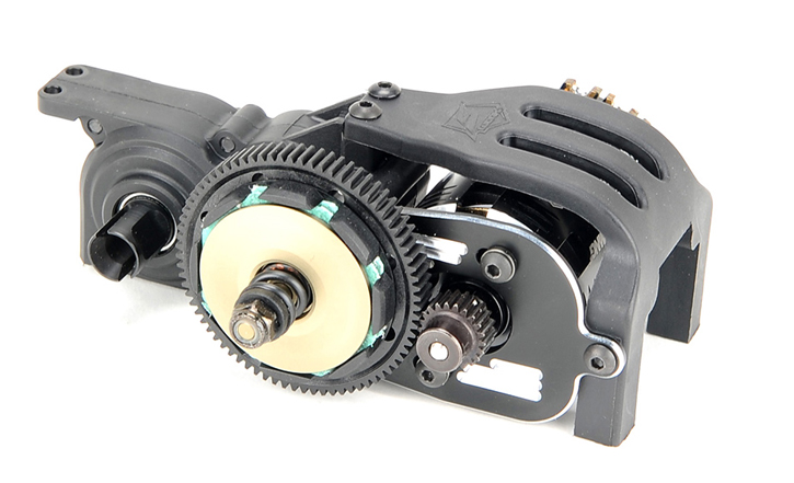 The rest of the box builds up very nicely and freely, we did add some grease to the idler gear which is not mentioned in the manual though we felt it worth doing. There is a very nice CNC motor plate which is in keeping with the hinge pin hangers and shock tower to finish the gearbox assembly off.