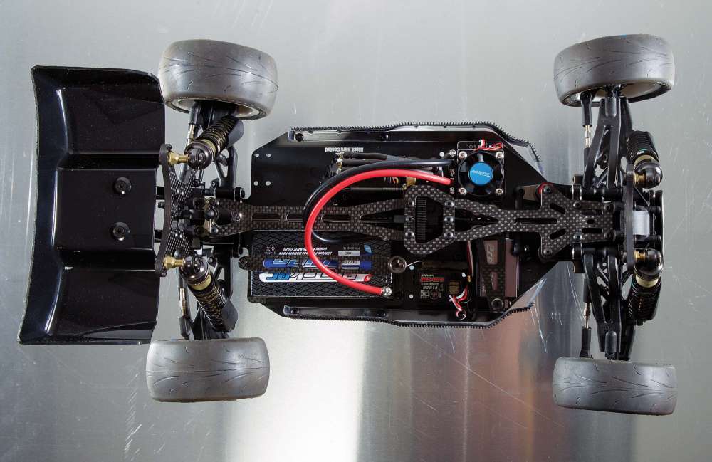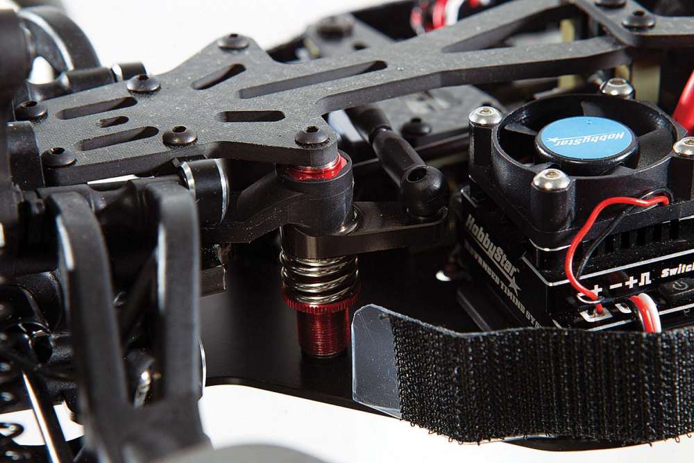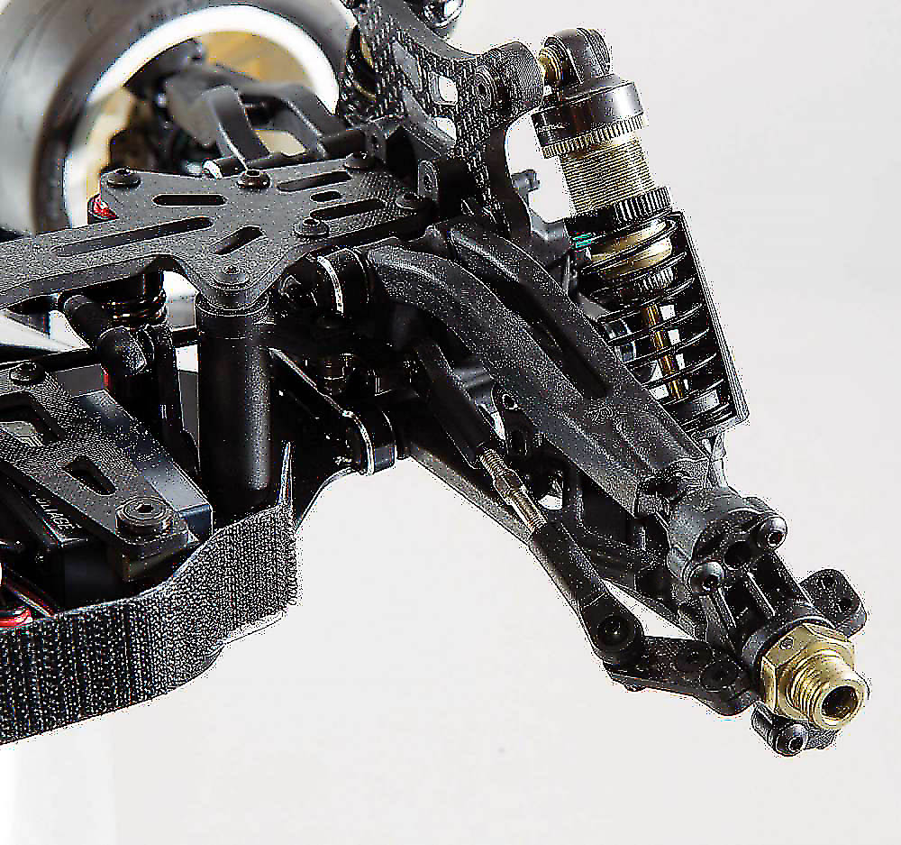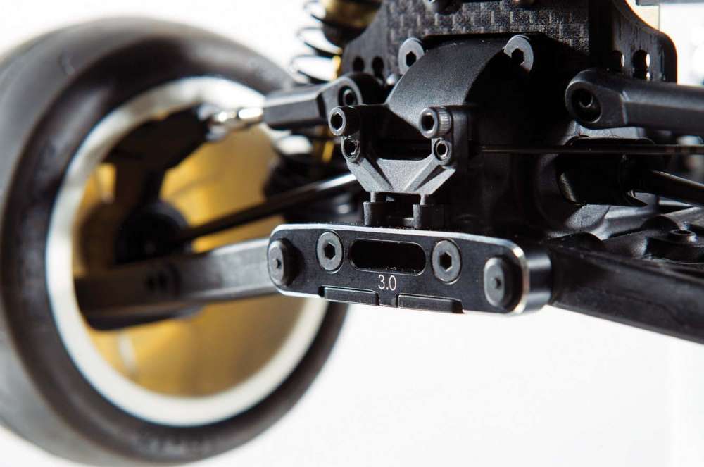 No main stream 1/10 design in the front suspension here folks. The front suspension uses a pillow ball style set-up with firm composite plastic upper and lower control arms. Inserts on the lower and upper aluminum hinge pin mounts are also adjustable. Big Bore emulsion style shocks with Ti-Nitride shafts, silicone o rings and hard anodized shock bodies also feature dirt shield spring perches. Rear suspension is typical upper camber link, lower control arm and also adjustable inserts at the lower hinge pin mounts. Super thick carbon towers provide the mounting point for the upper aluminum shock mounts.