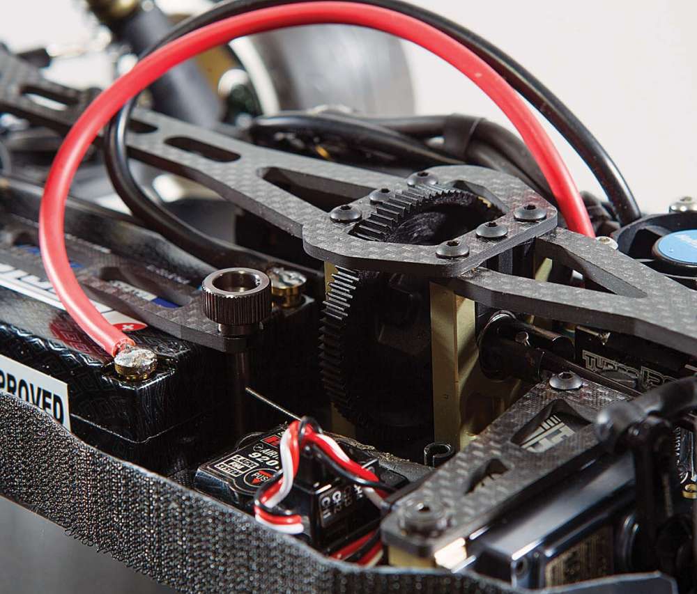 Three fluid filled differentials with smooth mesh work with lightweight steel driveshafts to get power to the wheels. Of course, the entire driveline rides on quality bearings. The center shafts enter the gearbox in a well-designed way. The bevel pinion also serves as the cup for the driveshaft so pins can’t be ejected from the universal. A cam style motor mount provides simple and quick pinion adjustments. The position of the clamp bars screws are easy to get to for gear mesh adjustments.