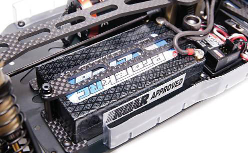 The chassis can be built to accept shorty or saddle-type battery packs, and carbon-fiber plates on the chassis keep them from sliding around.