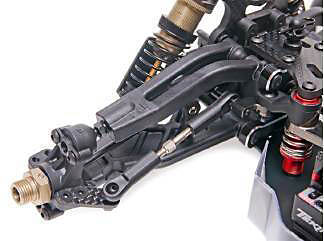 The front pivot-ball suspension on the S104 offers a lot of adjustment. Width, camber, caster, and roll-center positions can be adjusted easily and quickly.