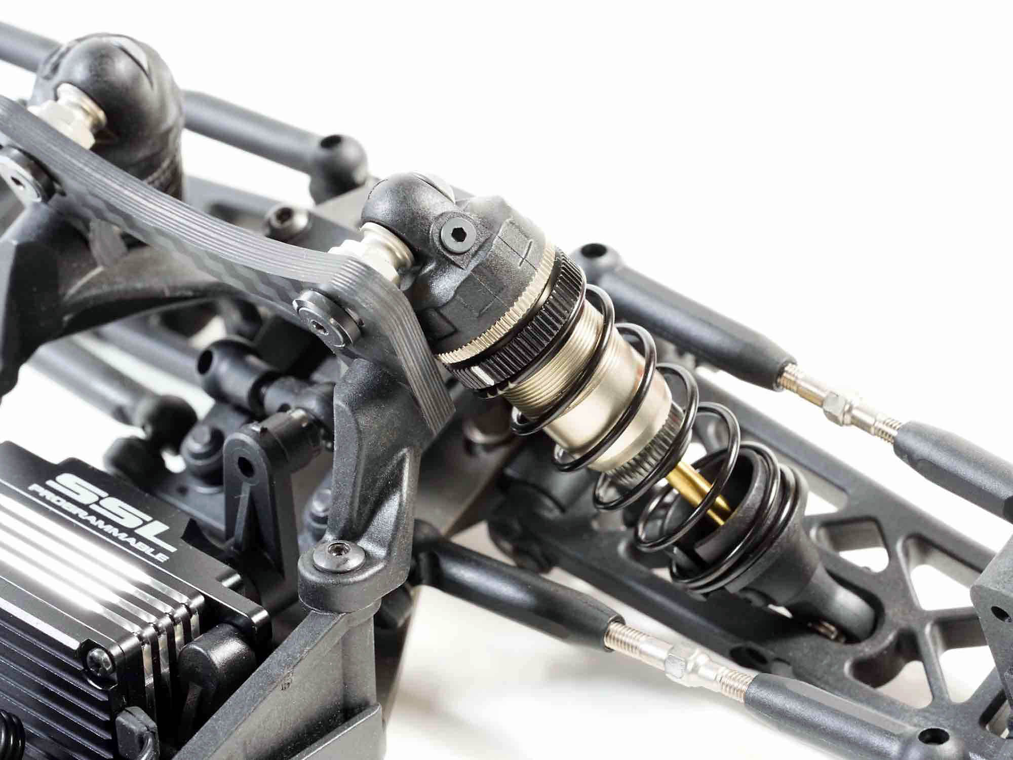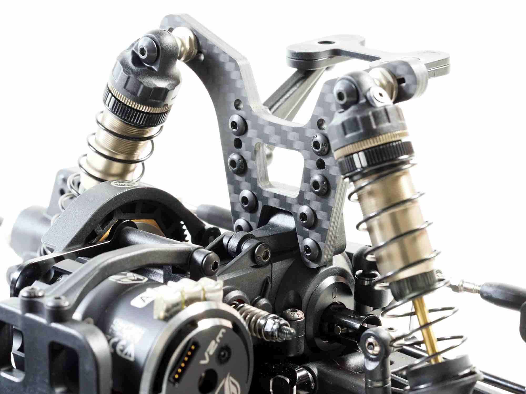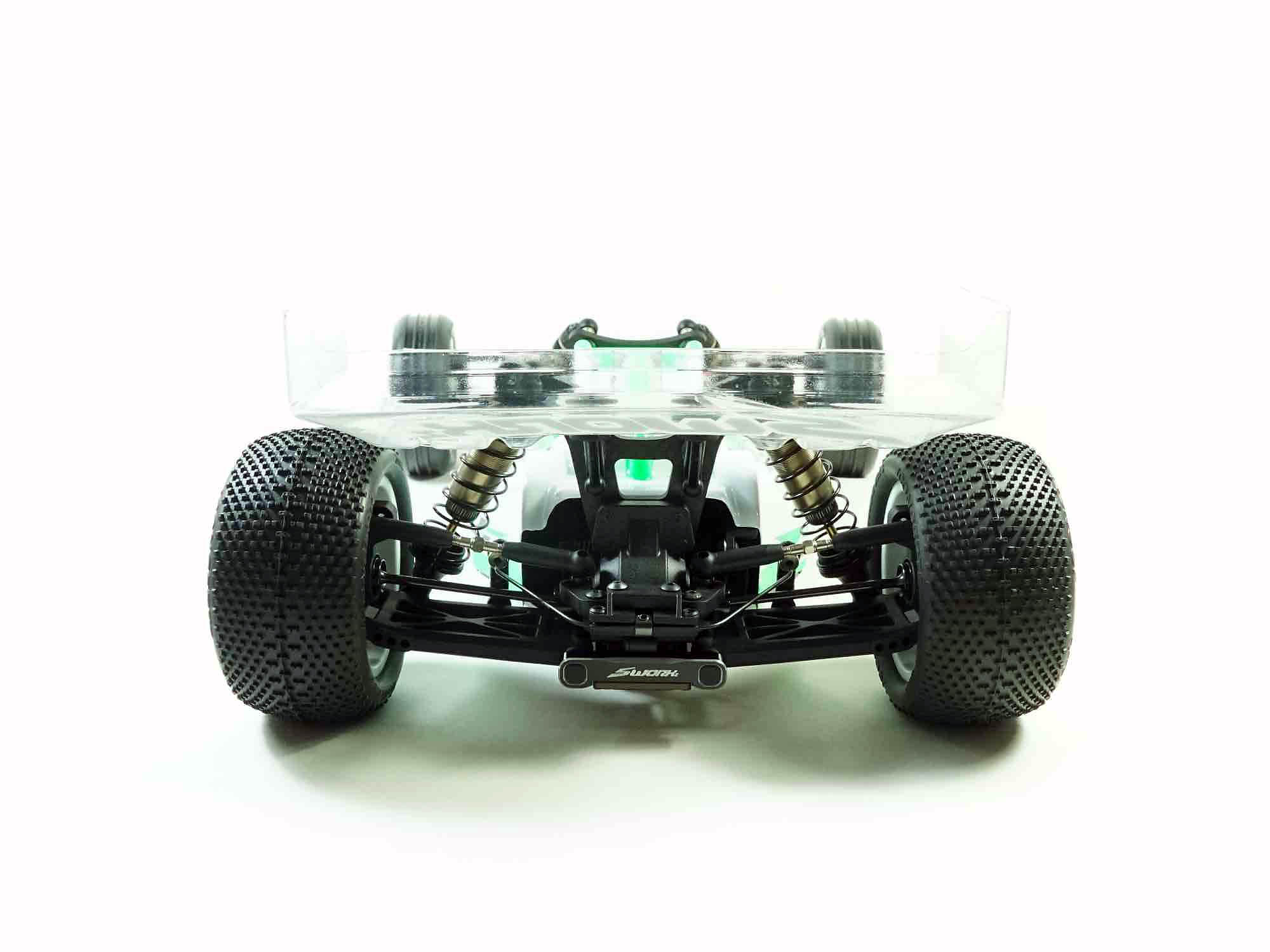 The S12-2D comes with a brand new designed 1/10 Pro-Shock System. It has got new Emulsion Precision Plastic Shock Caps and Shock Pistons with Seal Parts. The S12-2D Kit includes 4mm dirt version Carbon front shock towers and a new designed front C-Hub geometry. SWORKz Teflon coated shock shafts give the smoothest function, you can imagine. Black Line shock springs with a new designed, rotation protected spring holder, are standard in the SWORKz S12-2D kit too.