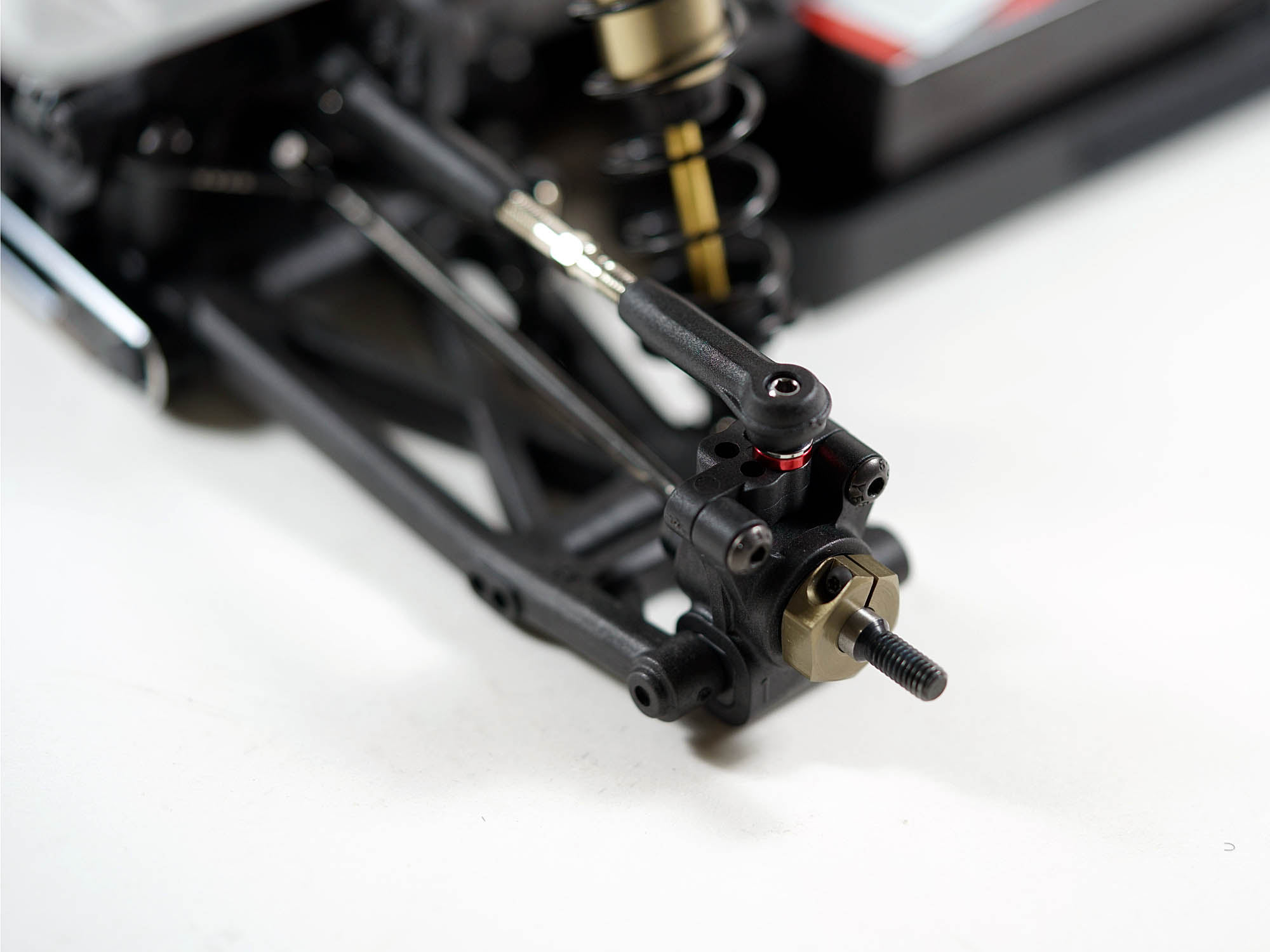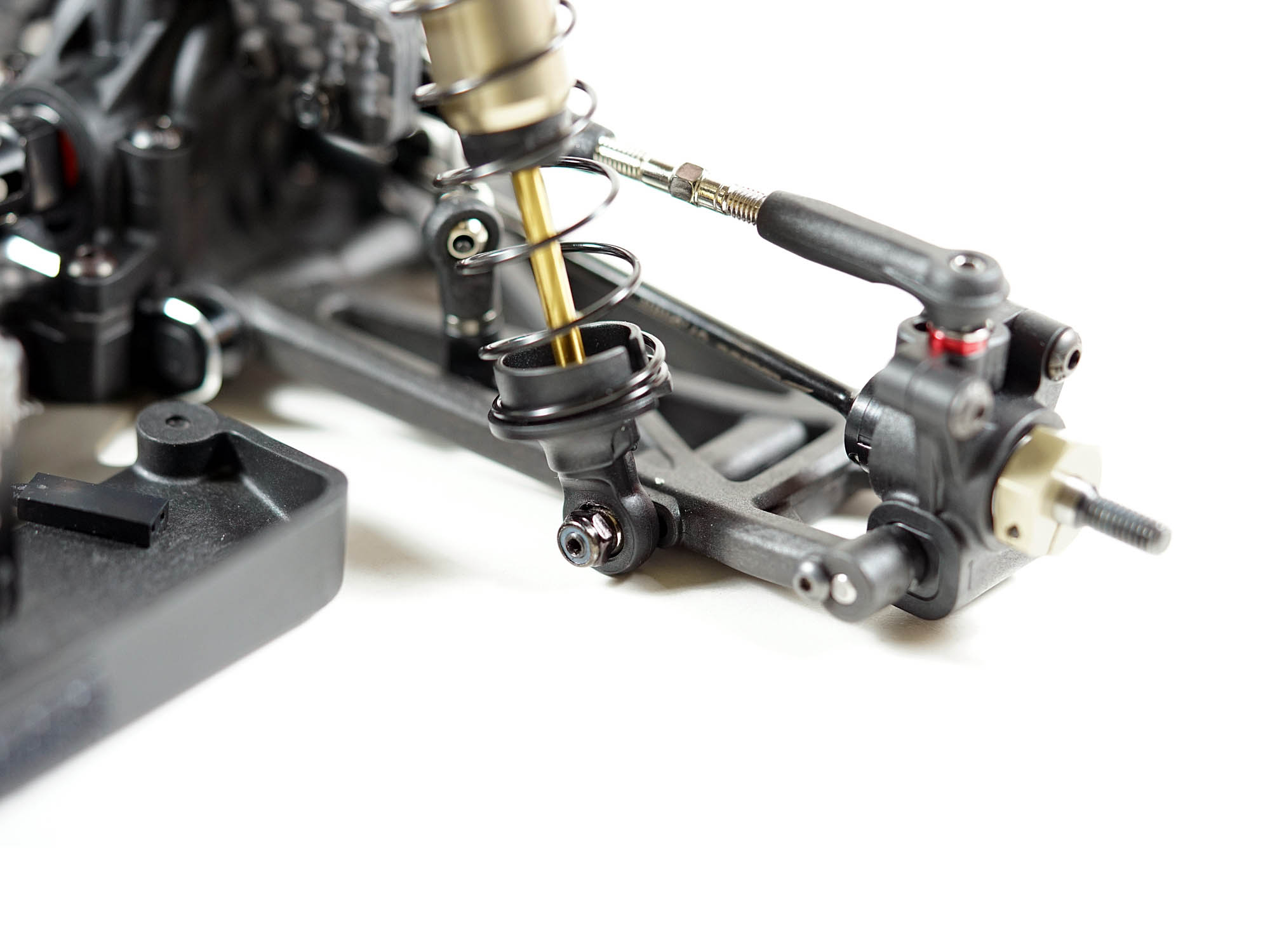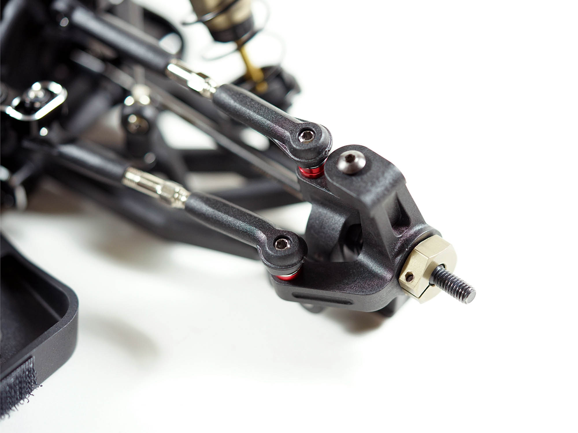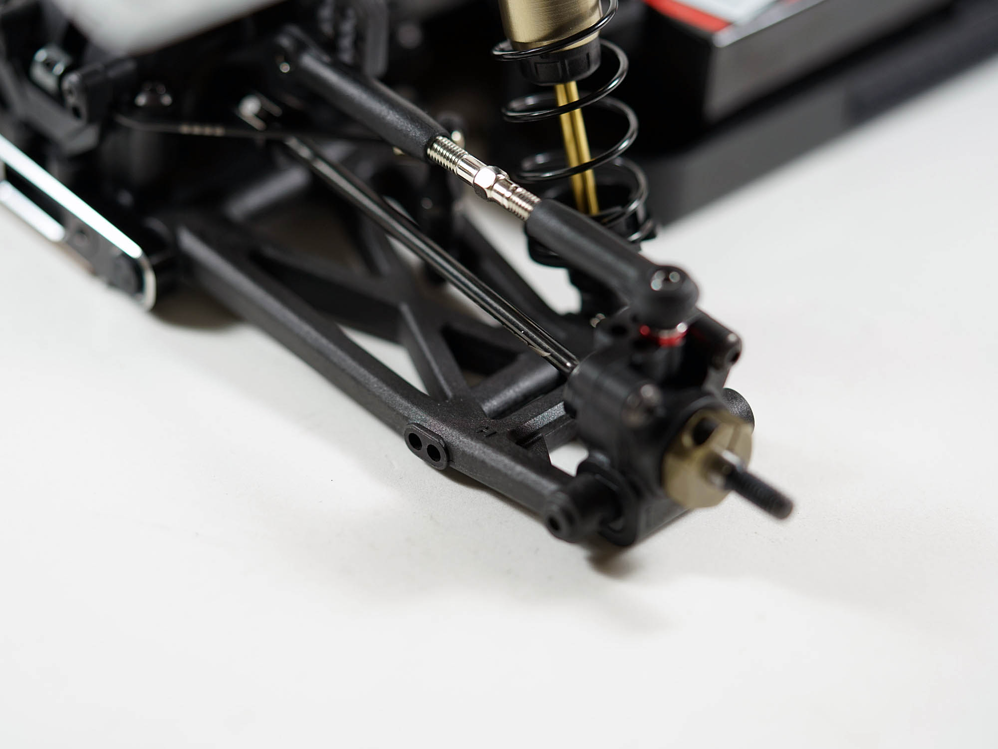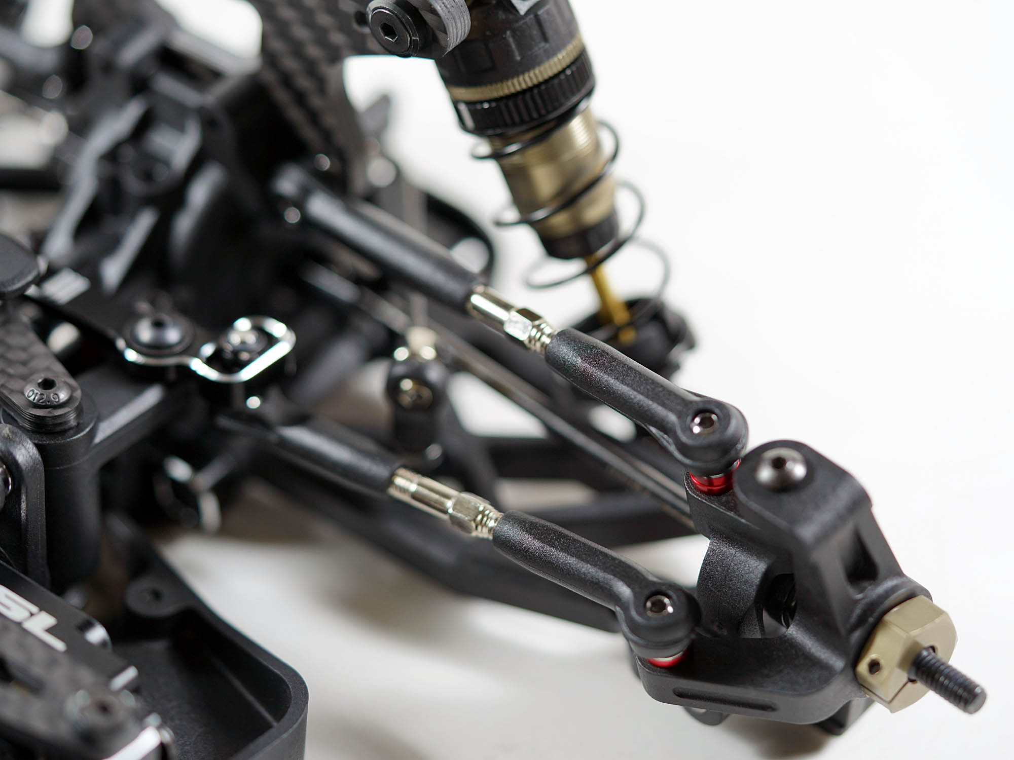 A brand new 5.5mm linkage ball stud system and 3.5mm durable turnbuckles are included in the S14-4C kit. Brand new adjustable ackermann plate with lightened steering bell crank System are included too. The S14-4C has new rear angled lower arms that provide a lower Shock position which leads to a lower center of gravity.