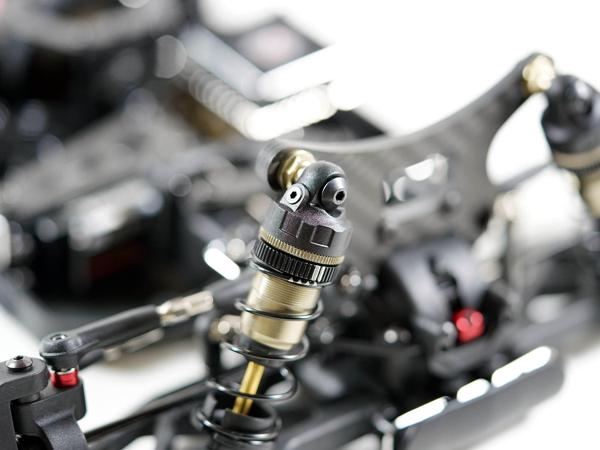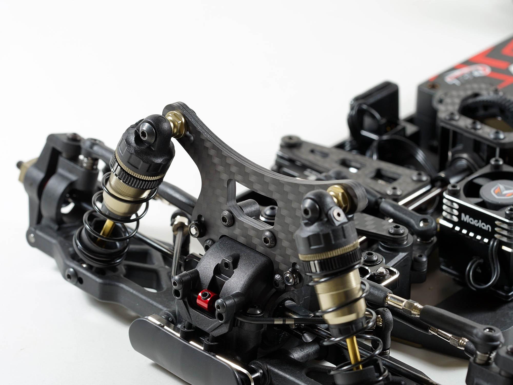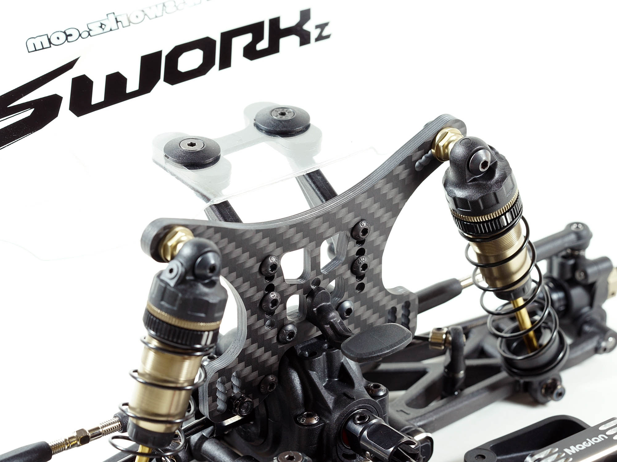 The S14-4C comes with SWORKz brand new designed 1/10 Pro-Shock System (Short version). The shocks come with new Emulsion Precision Plastic Shock Caps, Shock Pistons with Seal Parts. The kit comes standard with a 4mm carbon carpet version for both front rear shock towers. The Teflon coated shock shafts provides smooth shock reactions. Black Line springs which are good designed with rotation fixed spring holders comes standard in the SWORKz S114-4C kit.