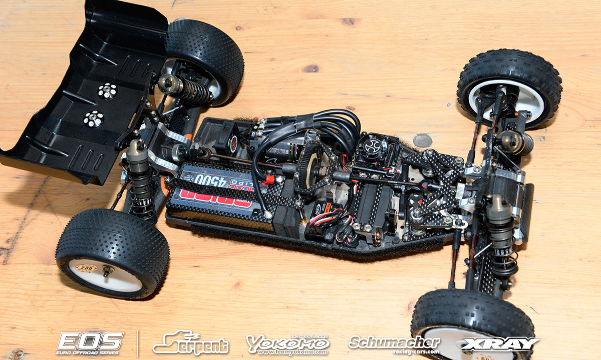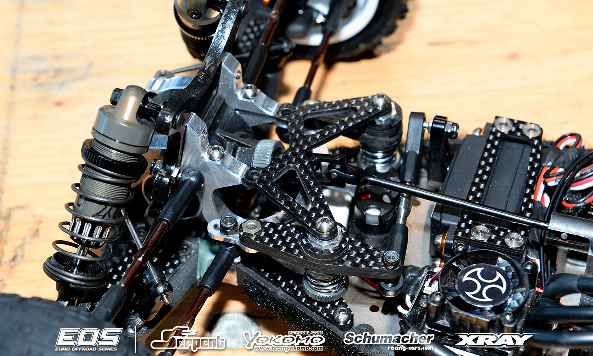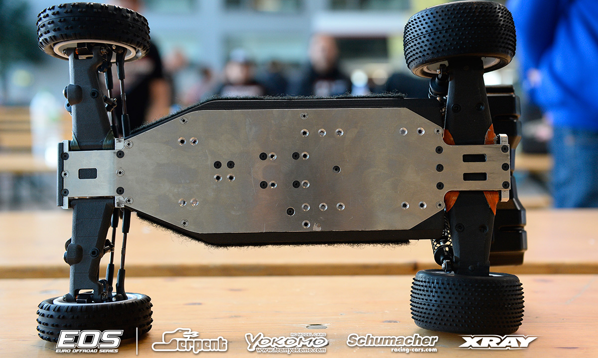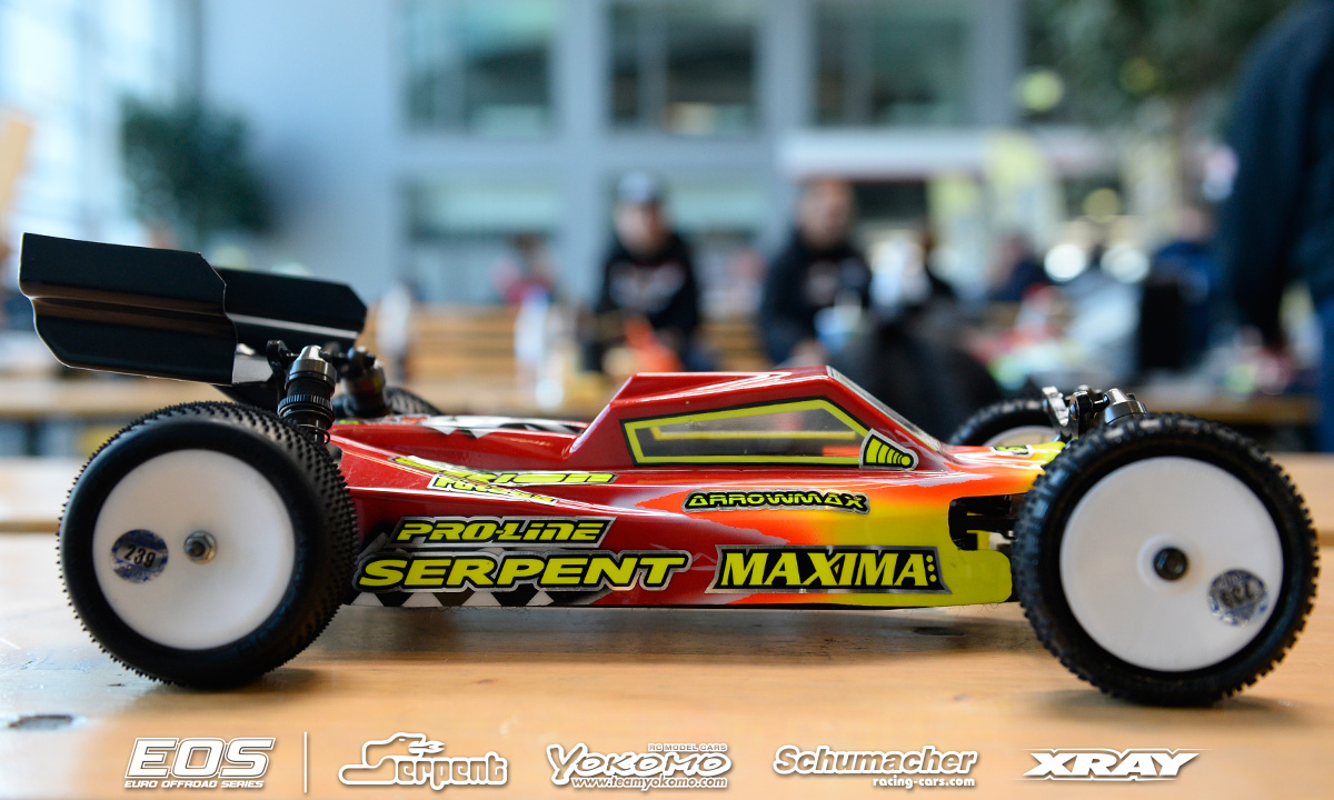Remarks – Former EOS Champion Joern Neumann debuted the new Serpent 4WD Buggy, called SDX-4, here at the Nurburgring. The completely new car, still in a pre-production 3-D printed version, features a shaft driven transmission and a very simple layout that makes it a versatile platform with different weight distribution options available. The suspension arms can accept carbon stiffeners for different flex options while the rear arms offer 8 different shock positions.
