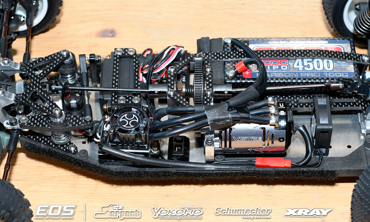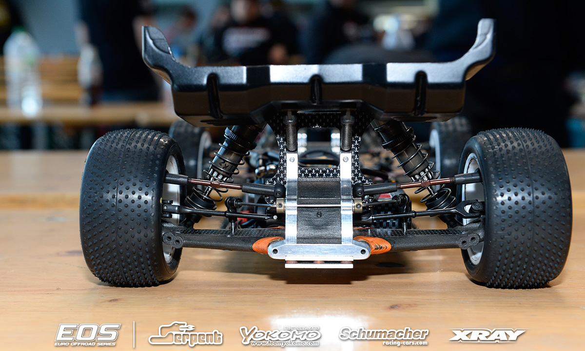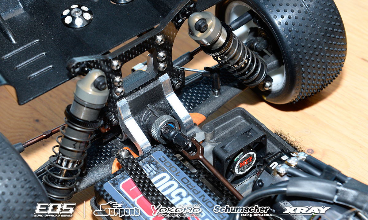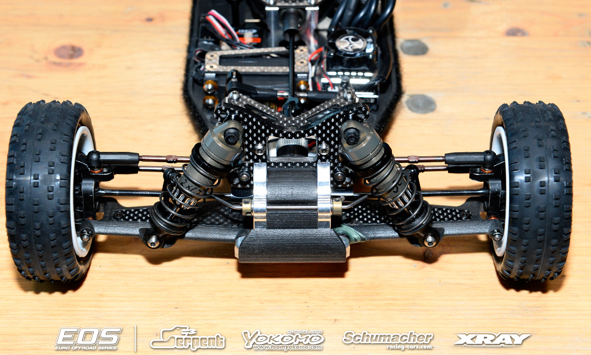 Remarks – Former EOS Champion Joern Neumann debuted the new Serpent 4WD Buggy, called SDX-4, here at the Nurburgring. The completely new car, still in a pre-production 3-D printed version, features a shaft driven transmission and a very simple layout that makes it a versatile platform with different weight distribution options available. The suspension arms can accept carbon stiffeners for different flex options while the rear arms offer 8 different shock positions.