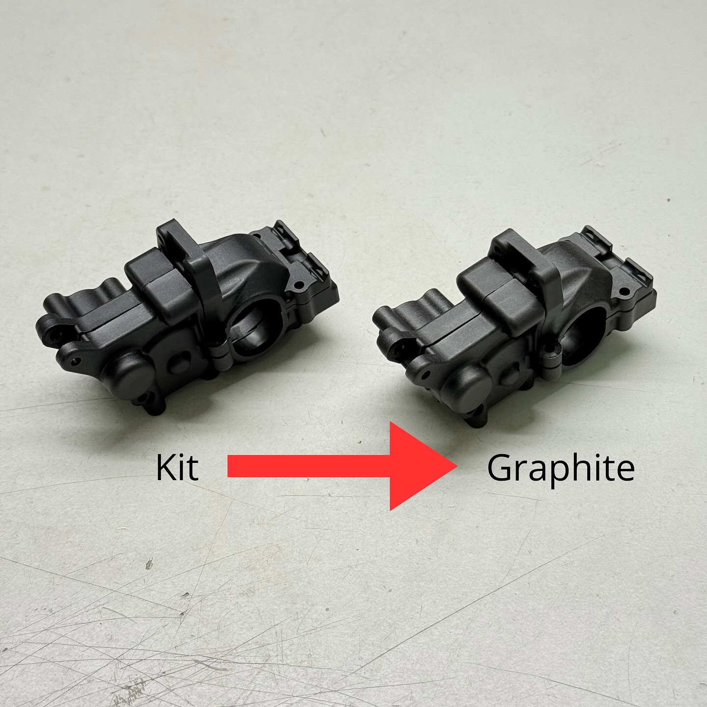 On high grip, and especially carpet, I like to replace the kit gearbox with the graphite mixture one. It reduces flex on the rear end, that adds more stability to the car. But the material is also more heat resistant, so it helps with keeping the temp of all the moving parts more stable, especially while being close to the motor. #323029-G