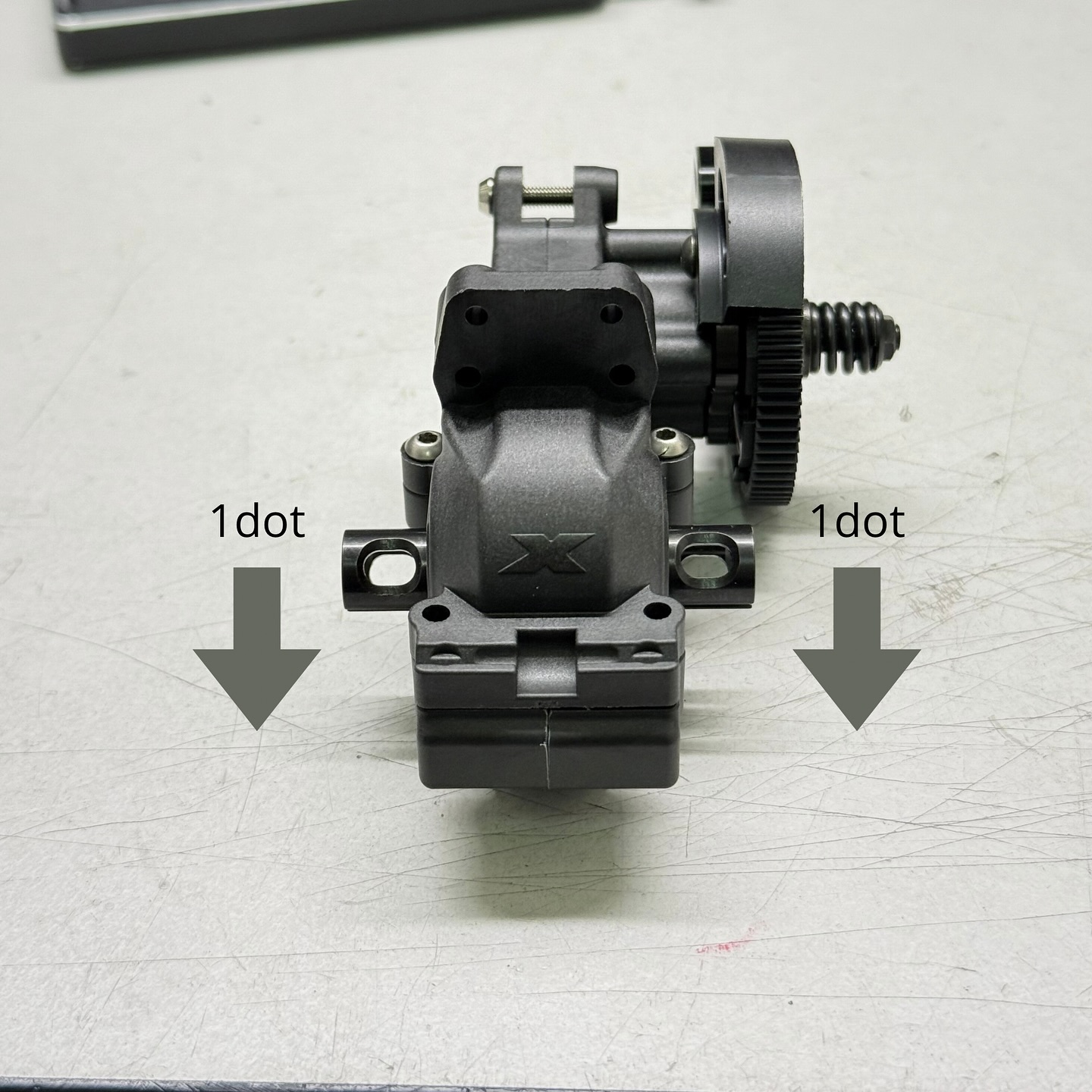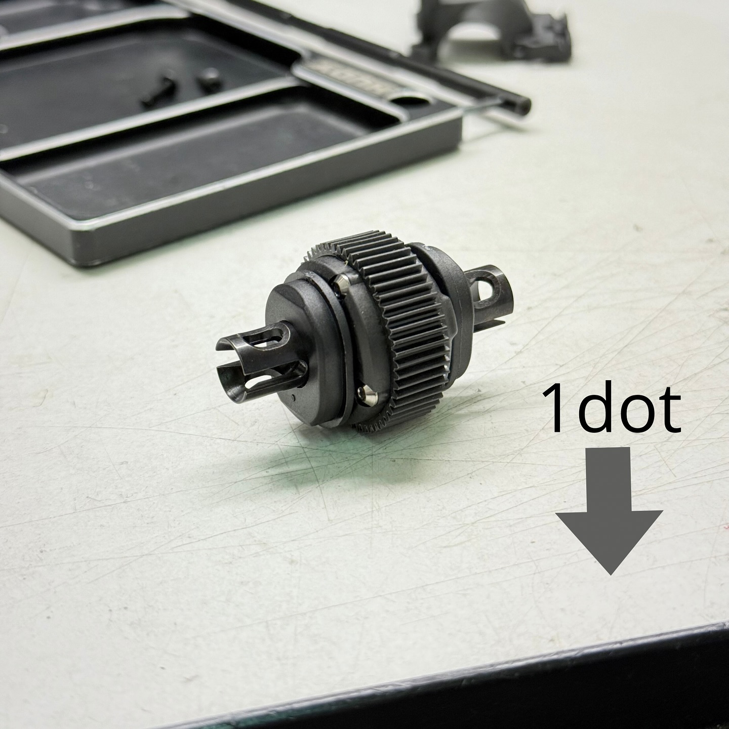 For carpet, I go with the kit setting of the diff height, that means 1dot up (dot facing down, diff up), as can be seen in the picture. When inserting the diff into the gearbox, always apply some grease to prevent any damage on the gears.
