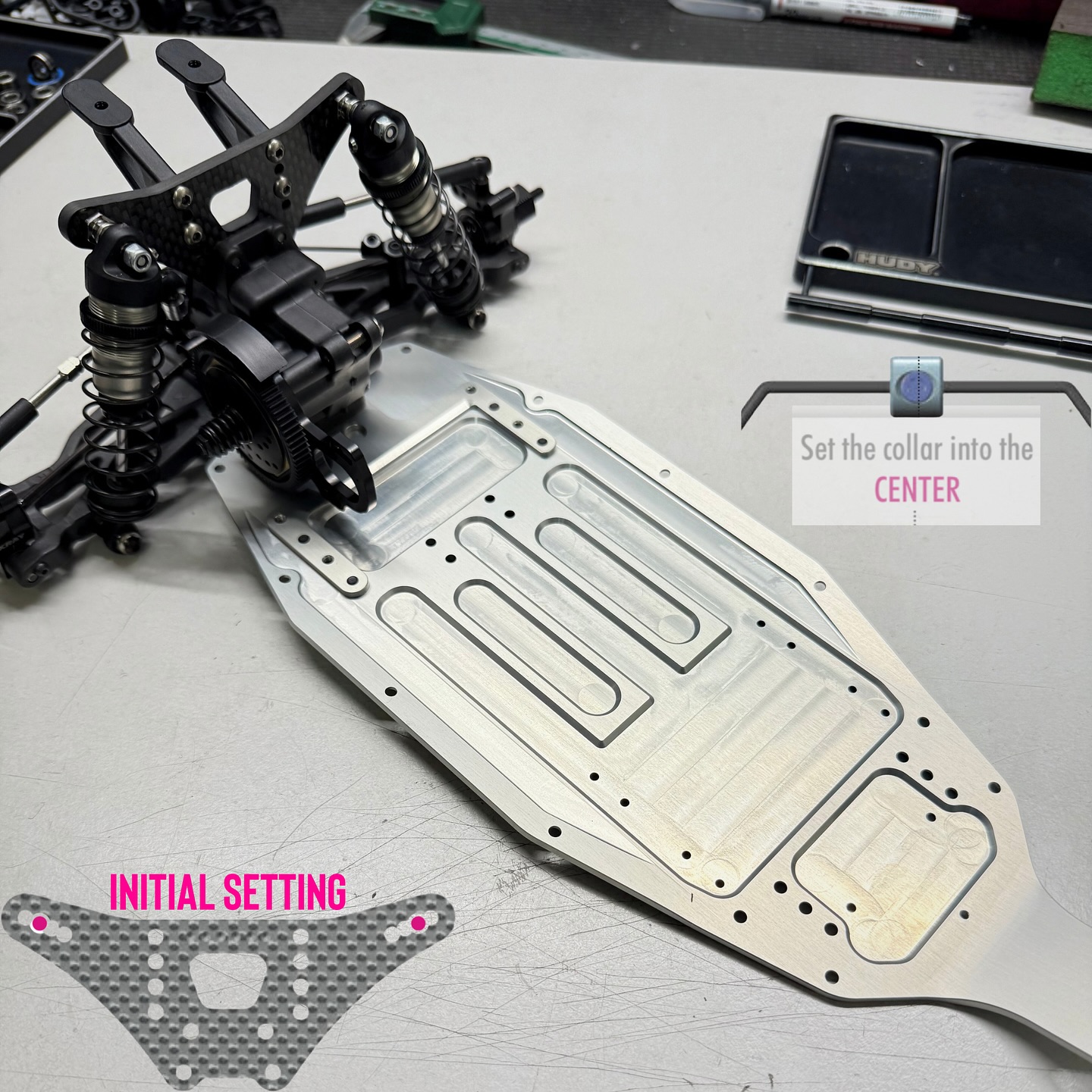 Toe - mounting the chassis brace and suspension holders on the car, I most commonly use 1° or 1.5° of rear toe-in. RF position (C block) up&out as well the RR position (D block) being up&out. This setting gives the car more stability I found, and is my go-to base setting for high grip tracks.