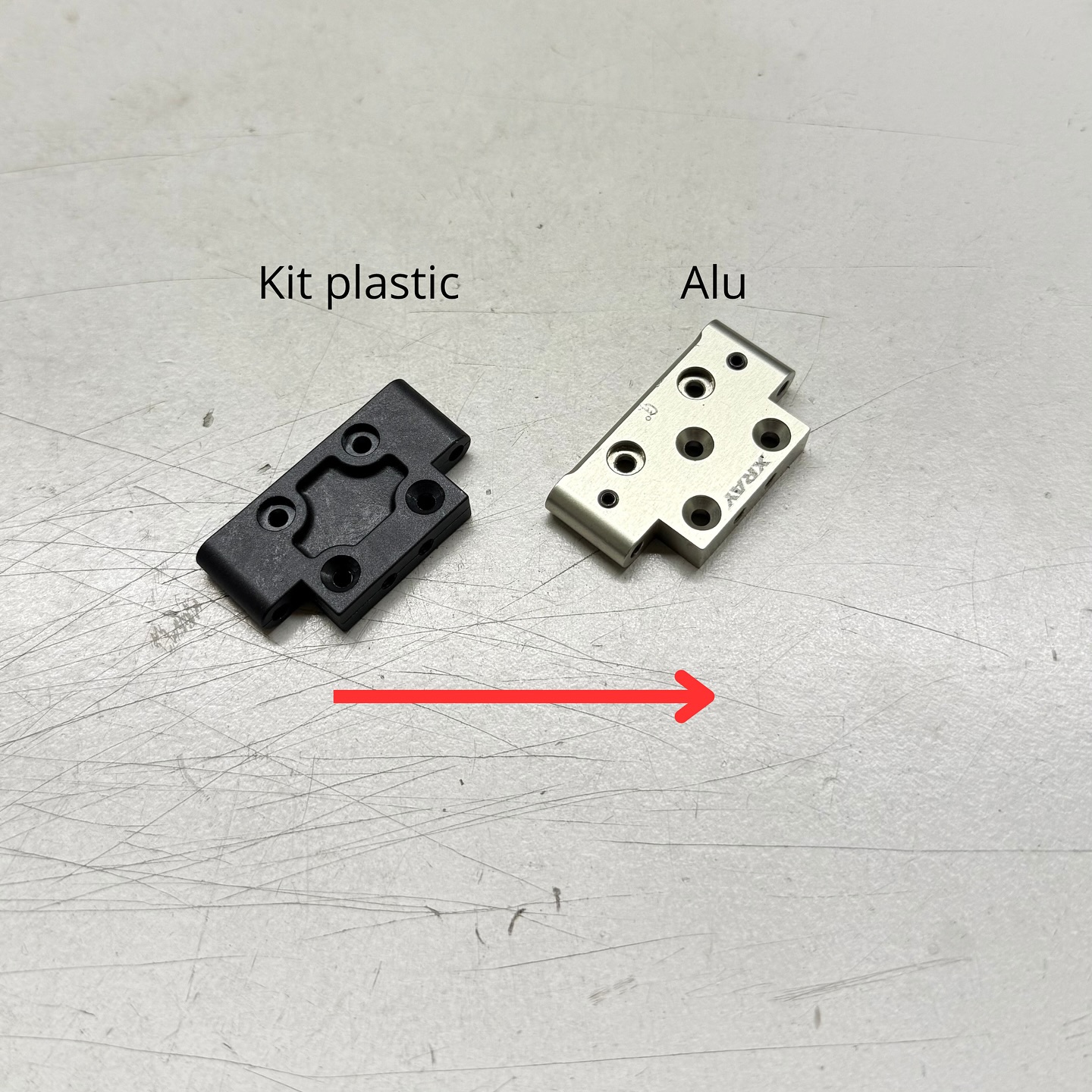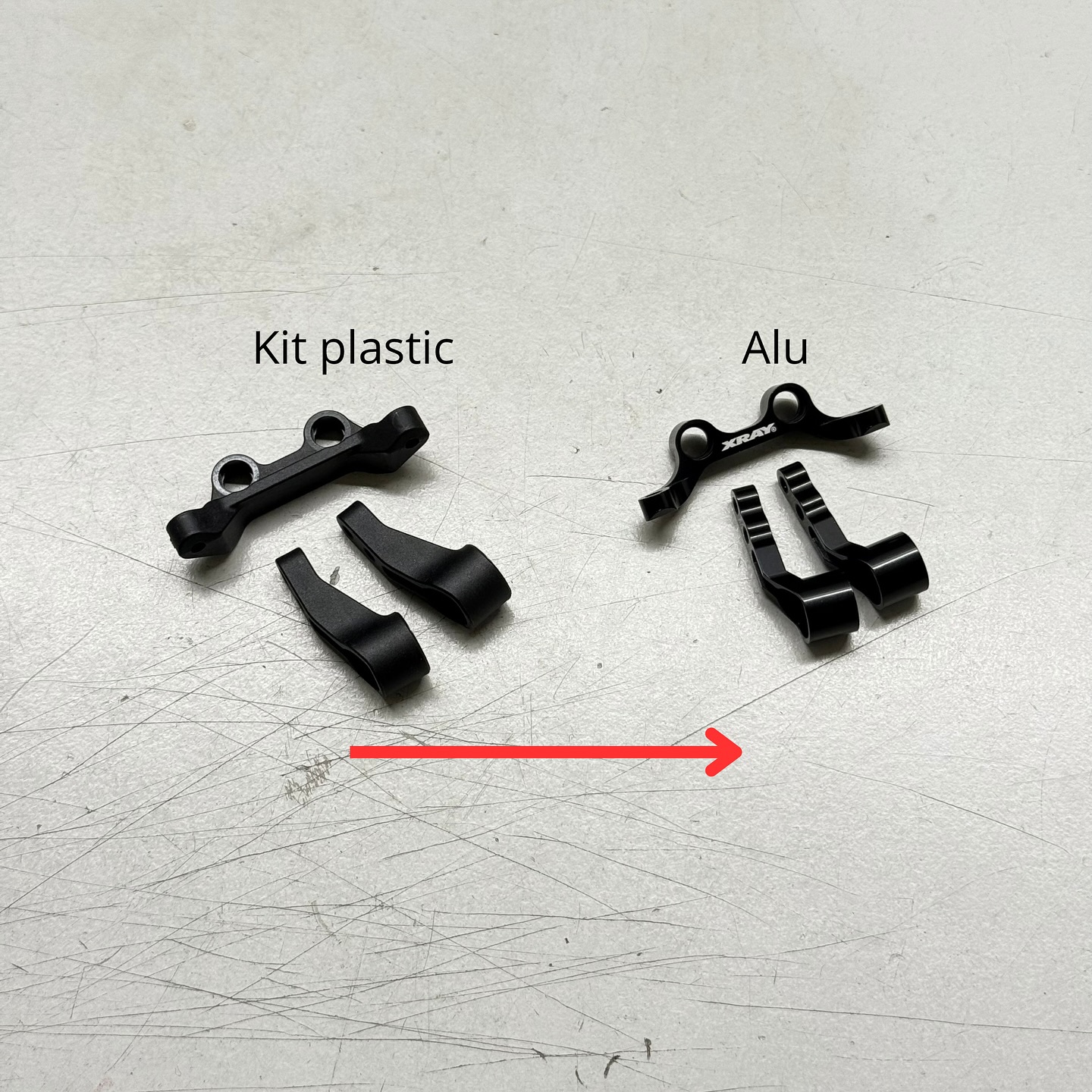 Steering arms and plate - the kit plastic is a great start for most drivers, and I personally use it on low grip dirt or astro, but for high grip carpet racing, the Alu options are a must for me. I swap both, the steering arms and plate for these: #322575 #322516
