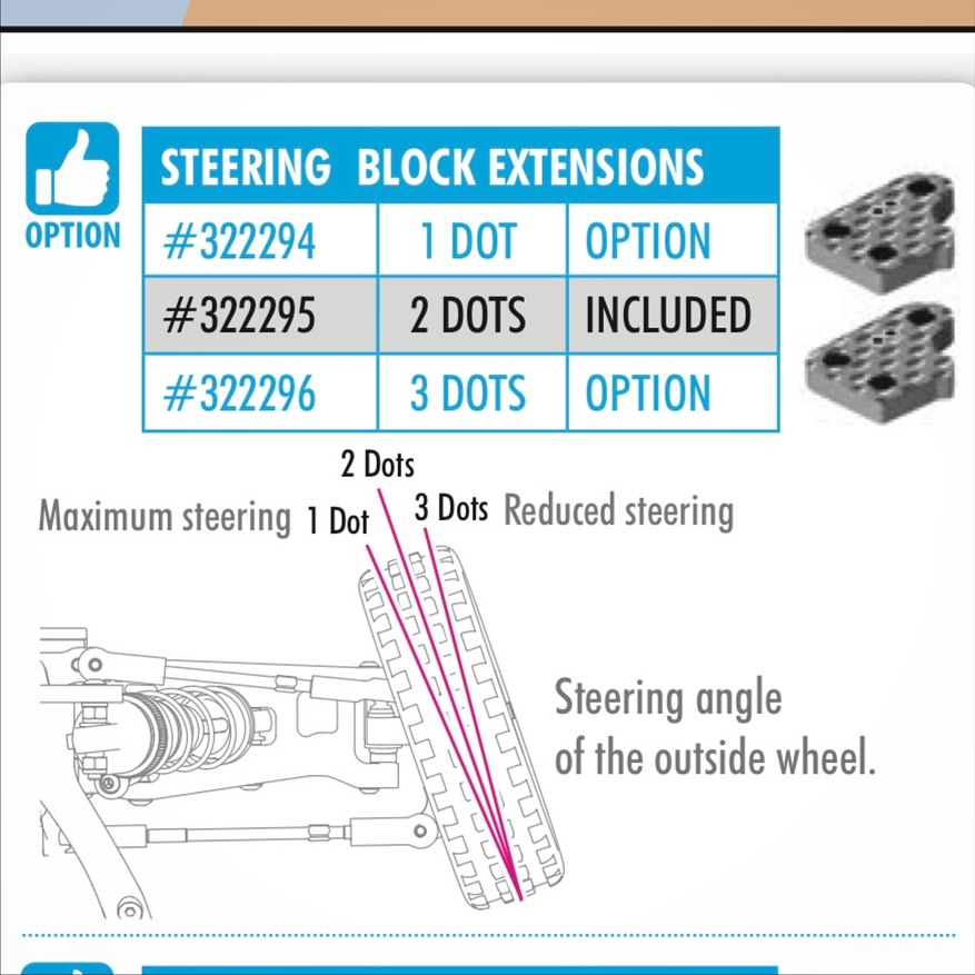 We have overall 3 options for the steering carbon extensions, 1-3 dot. The 1 dot makes the steering link the longest and the effect is more outside wheel turn, while the 3 dot does the exact opposite. Note that the inner wheel turn stays the same. While all three options are included in the alu set, you can get the 1/3 dot optionally for the plastic hubs also.