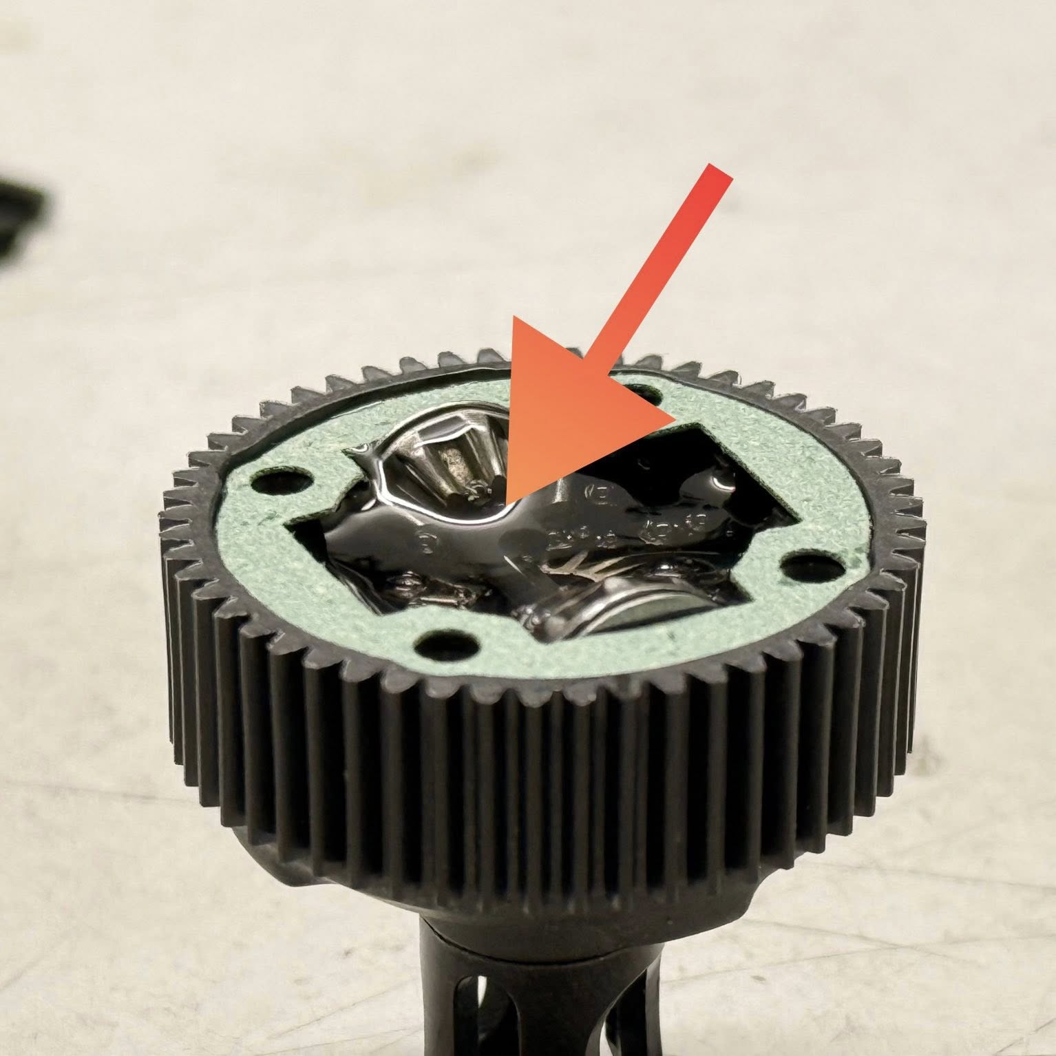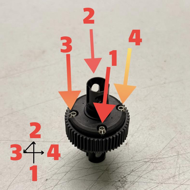 Make sure not to overfill the diff, so fill it up just above the diff pin. When you close the differential, make sure to tighten the screws in a cross order, as shown on the picture for proper function.