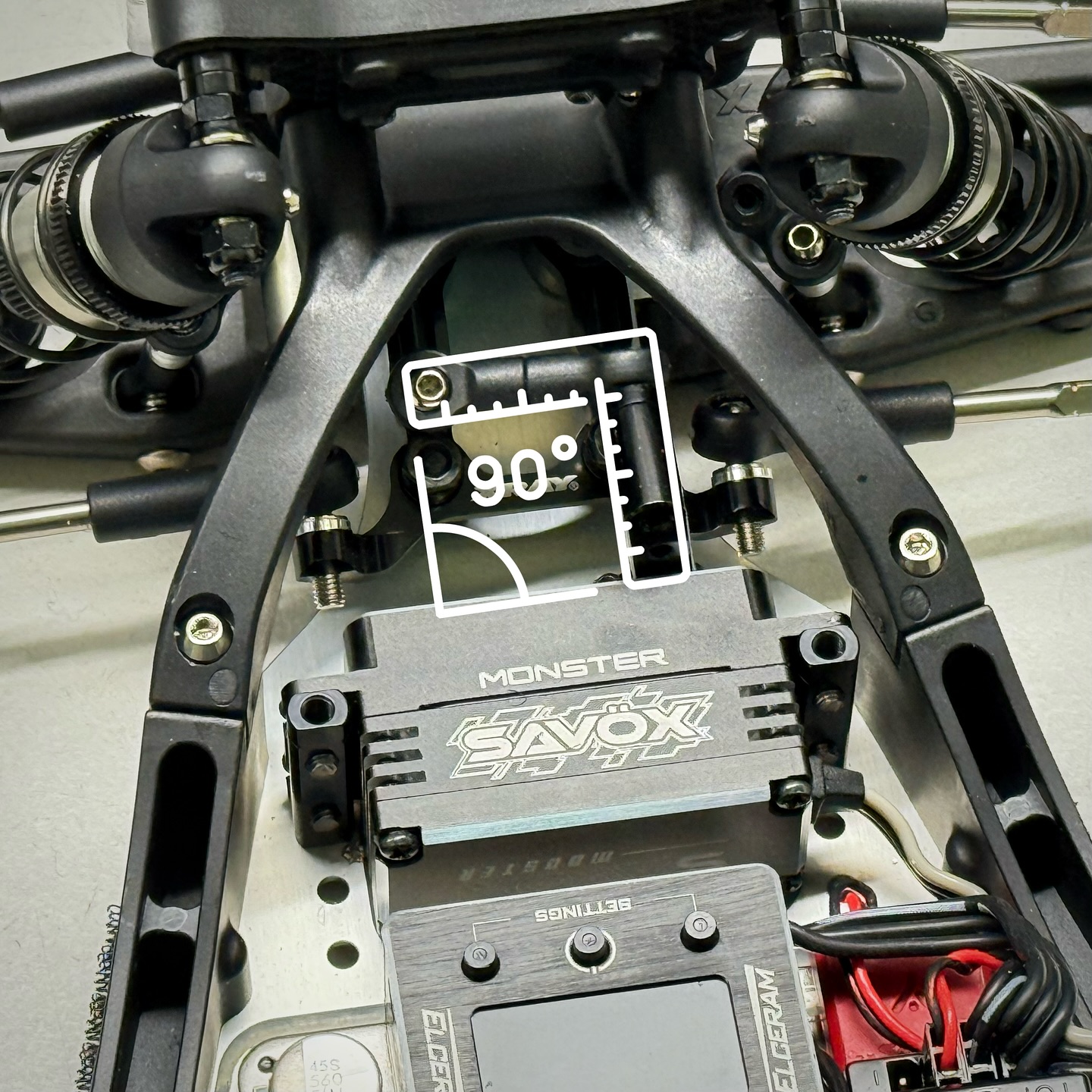 When mounting the servo, make sure all parts are moving freely and there is no touching or bind between parts. Especially when running the Alu steering plate, check that there is enough clearance between the steering link ball stud and the servo. You may either change the servo mounting position or change the ball stud length. Nevertheless, with the Savox SB-3262SG, there is no problem, when mounting it in the frontward holes and using the alu steering, when using at least 1mm of ackermann shims. Ensure the 90deg angle between the steering link and the steering plate, as is shown in the picture.