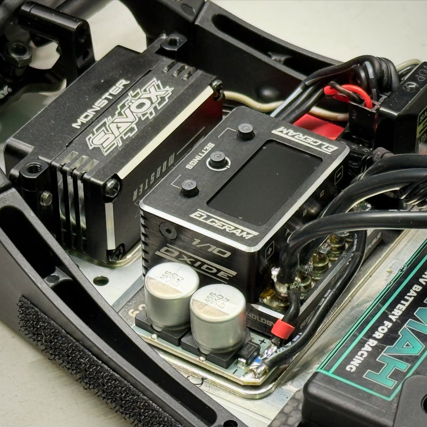 As I am using the low-profile Savox servo, there is plenty of space for other electronics. I mount the steel weight in the frontward holes for more forward weight balance. Mounting the Elceram RC G2 speedo and SANWA Electronic Instrument RX492 receiver on the steel plate is easy, as it fits perfectly together also with the transponder.