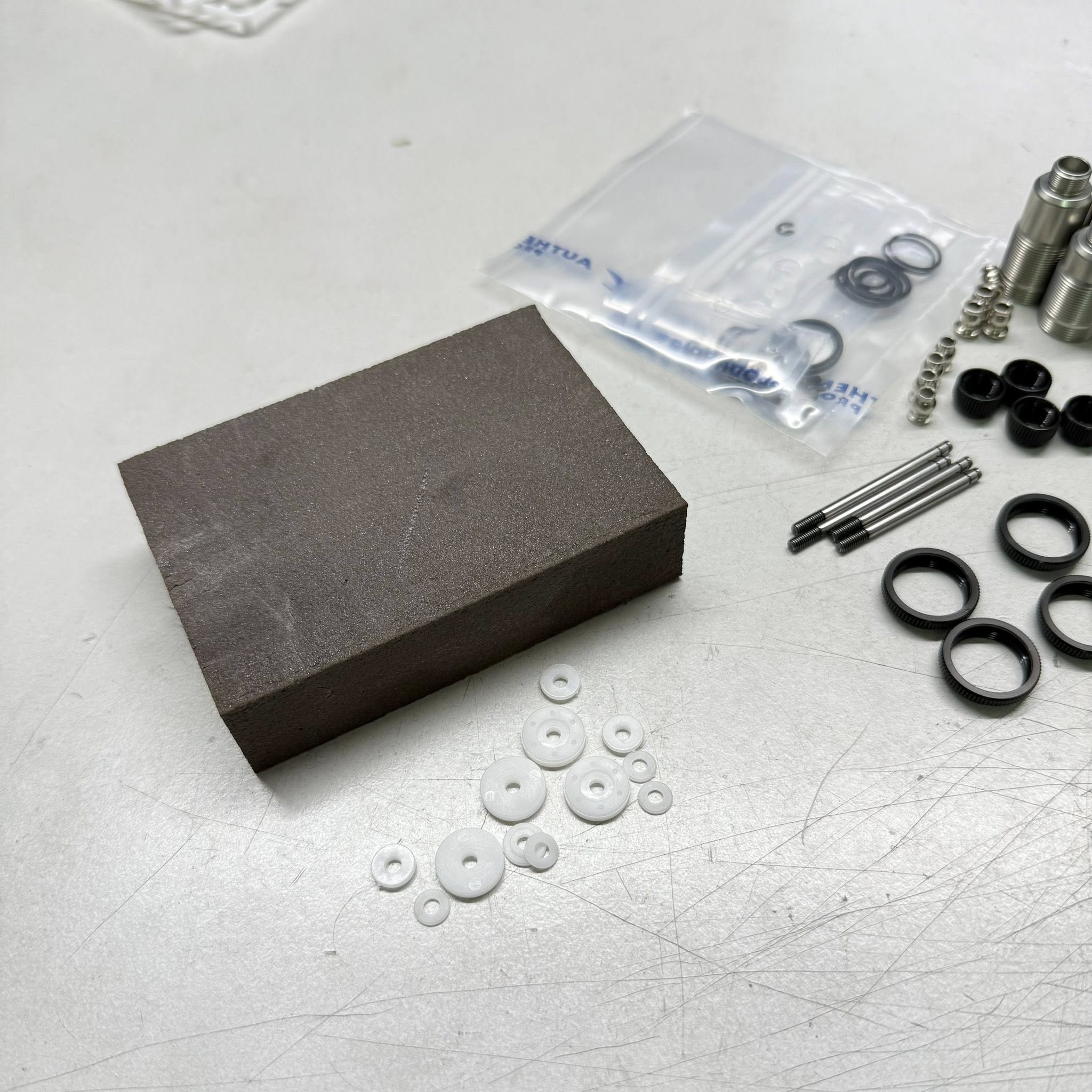 When taking all parts out of the box and cutting out the white plastics from the mould tree, it is highly recommended to check the edges of these parts, and preferably sand them down with using a fine sand paper or brick like I do. This will ensure perfect fitting in the shock bodies of all those parts and therefore a proper shock function.