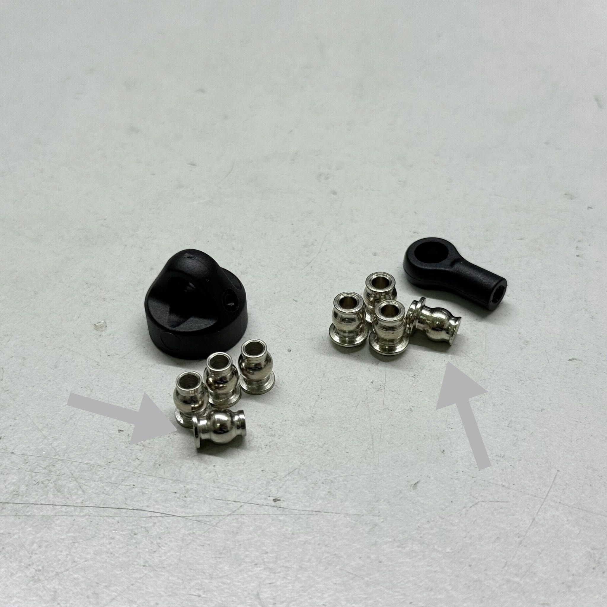 One quite common mistake while building these cars can be the pivot balls - make sure to separate the shock cap balls from the shock end balls. Even though they look similar, they have different shape. See the picture to recognize which balls belong where, or properly see it in the manual.