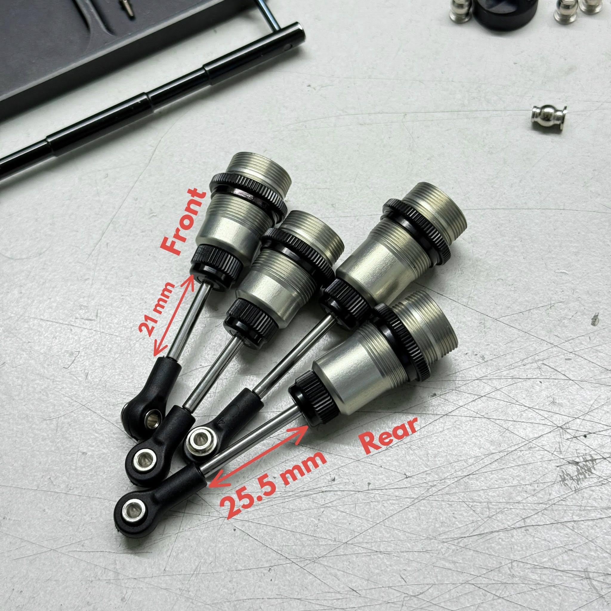 For my current carpet setup, I use the +2 shock ends in the front and +4 in the rear. The shock lengths I use is 21mm in front and 25.5 in the rear. Check my current setups on the setup forum to match the geometry with these shock lengths. Note that different shock length is needed when changing the front/rear hub height for example.