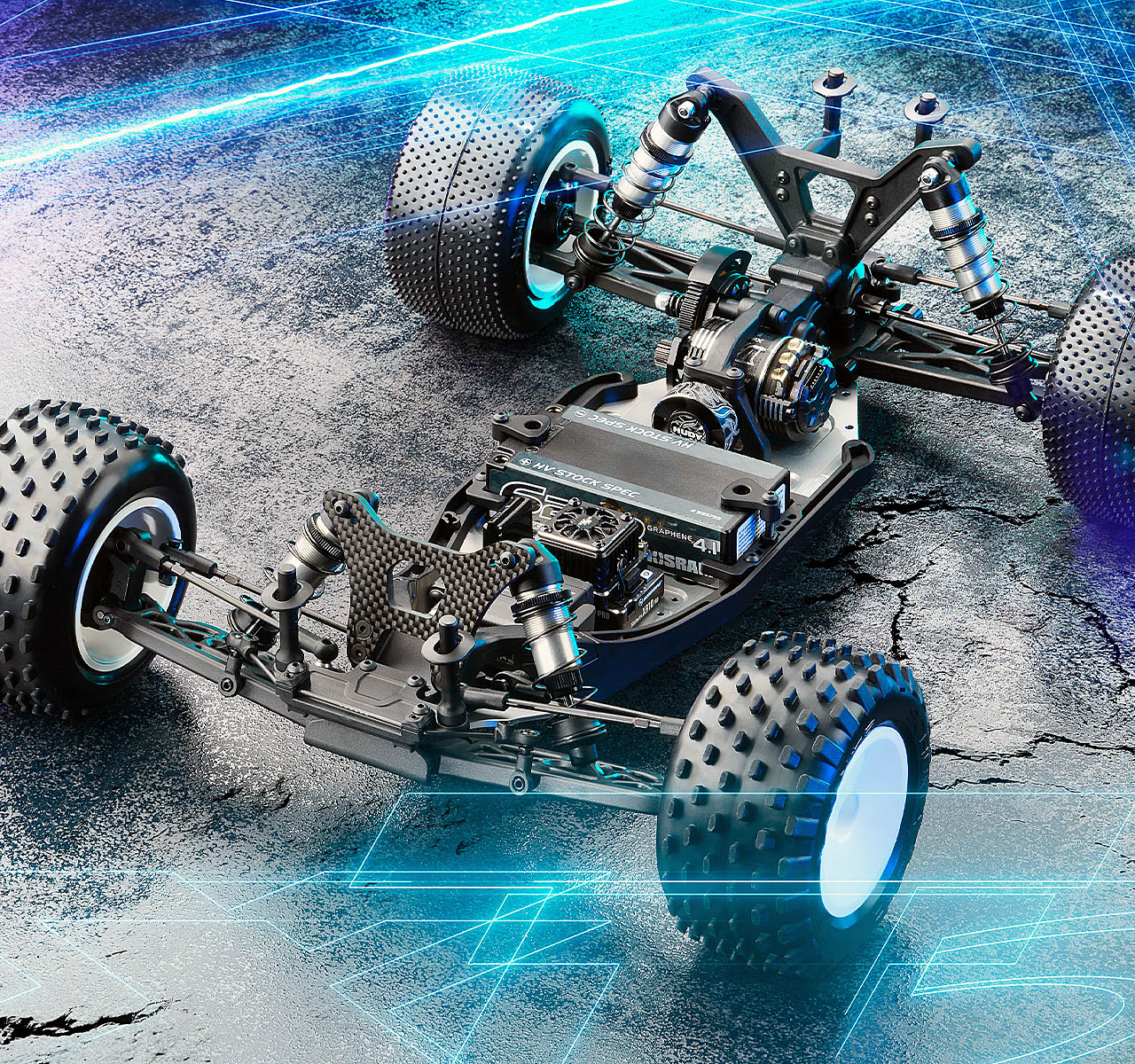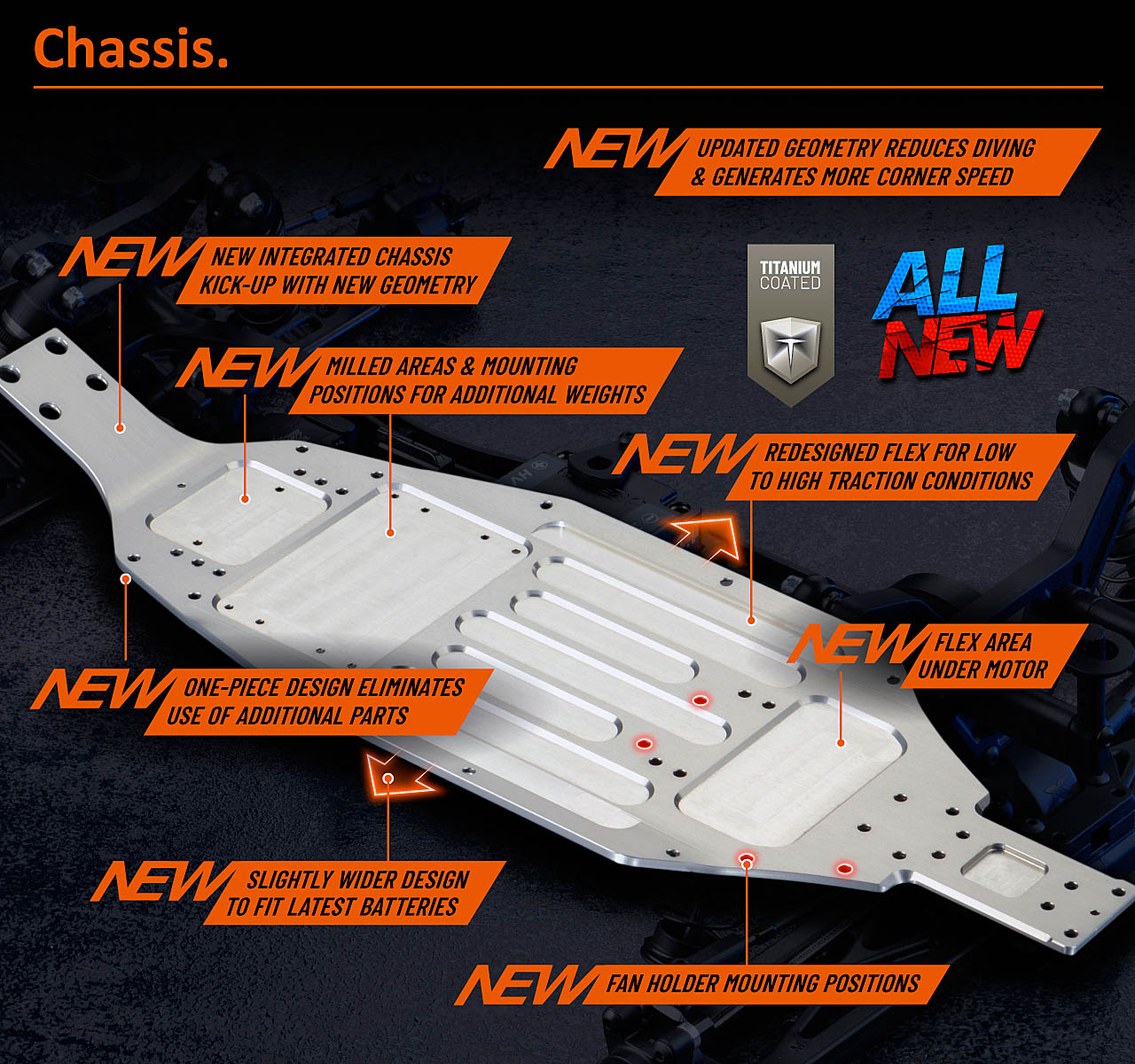 All-new one-piece chassis with integrated kick-up optimizes weight balance and flex with its new shape and chassis weight options, fits the latest battery types, and improves handling in all different traction conditions.