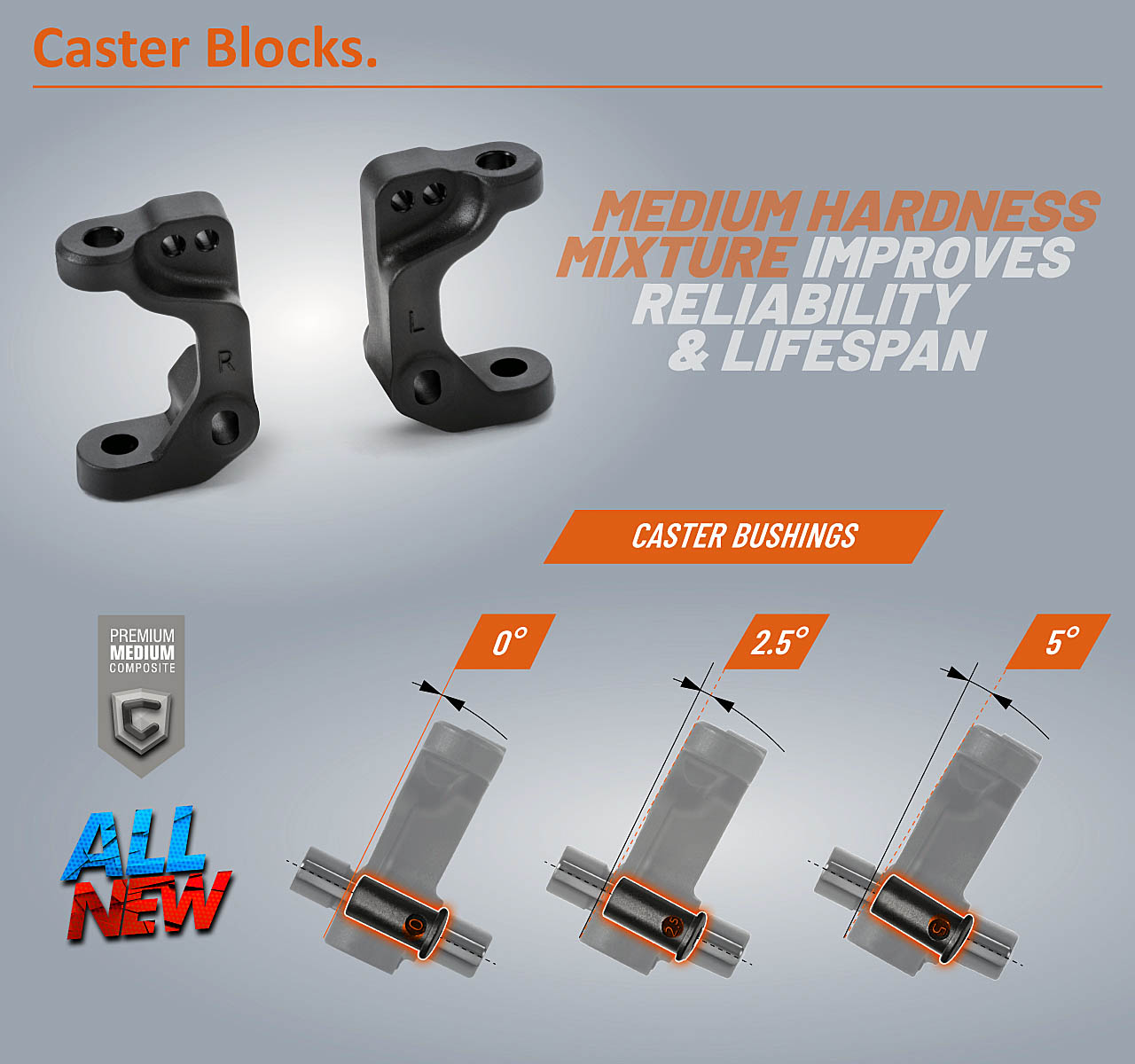 Caster blocks made from a new medium hardness material improve reliability. Different caster blocks hardness choices are available to tune set-up for any track condition.