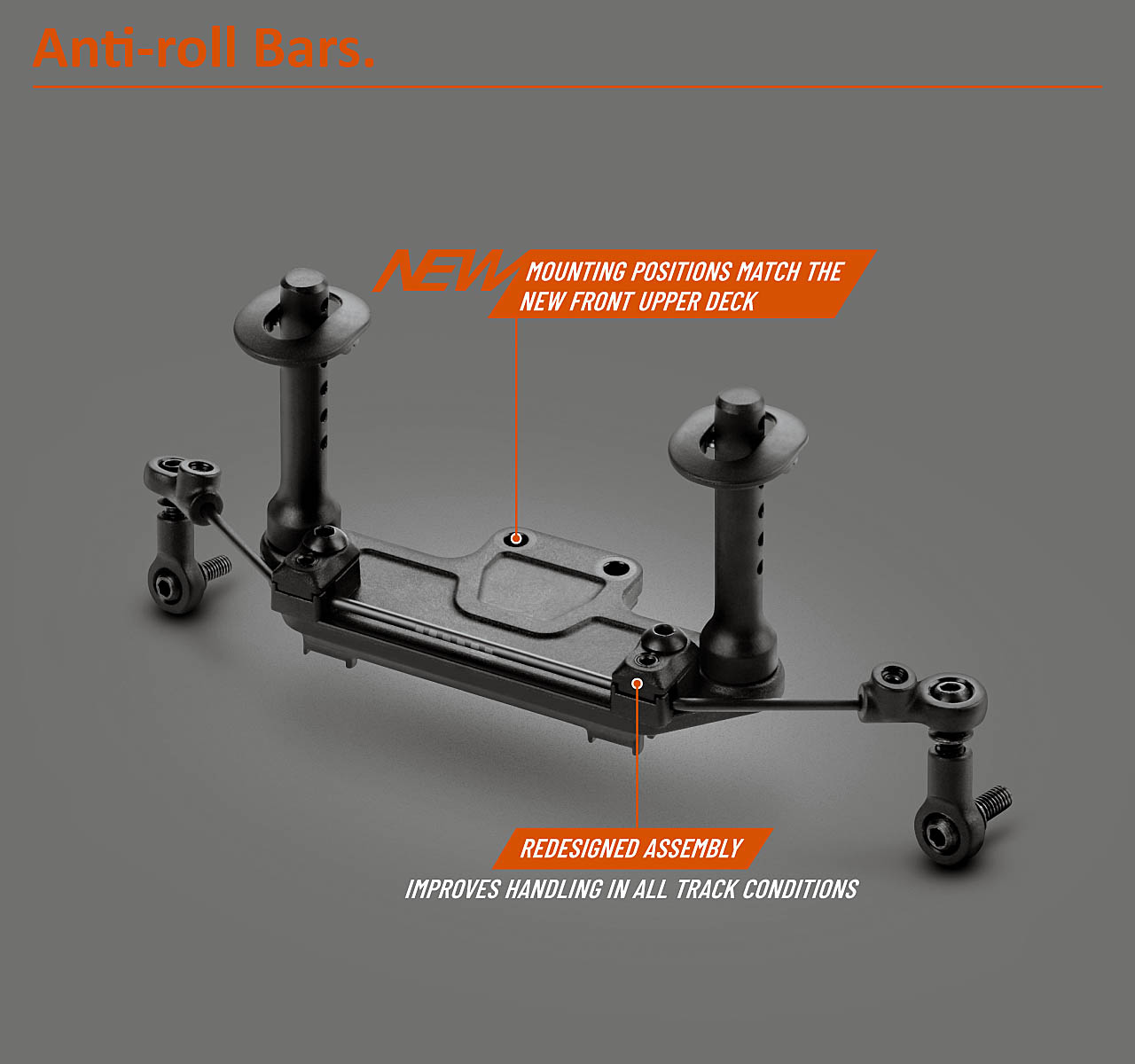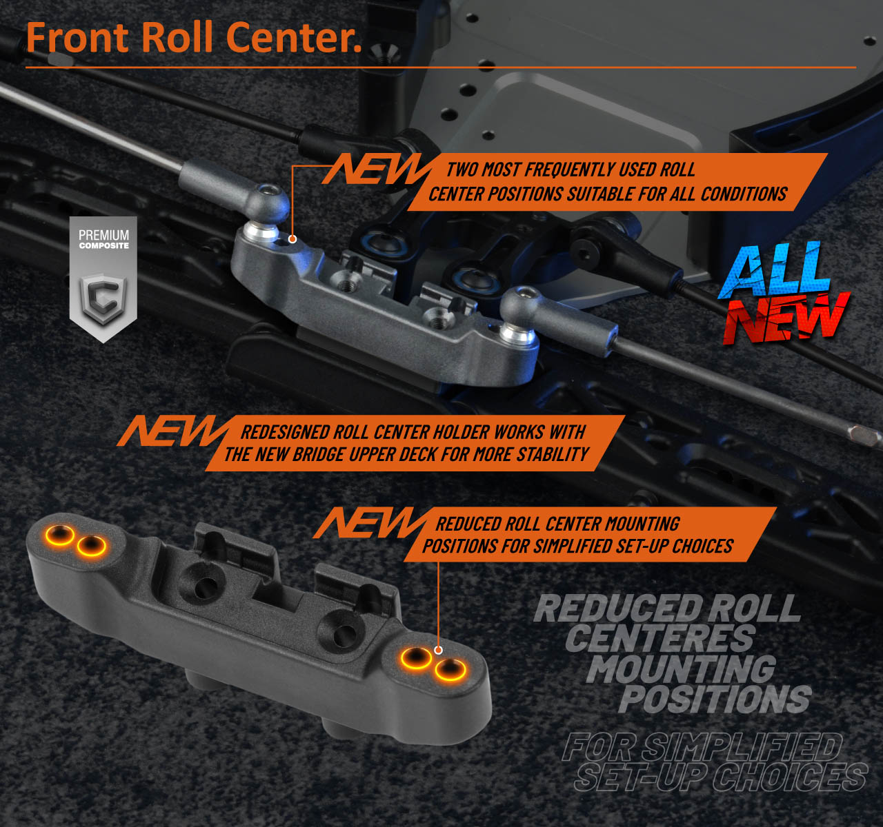 The new shape of the front roll center holder integrates with the bridge upper deck and simplifies set-up choices by reducing the roll center positions to the most frequently used locations.