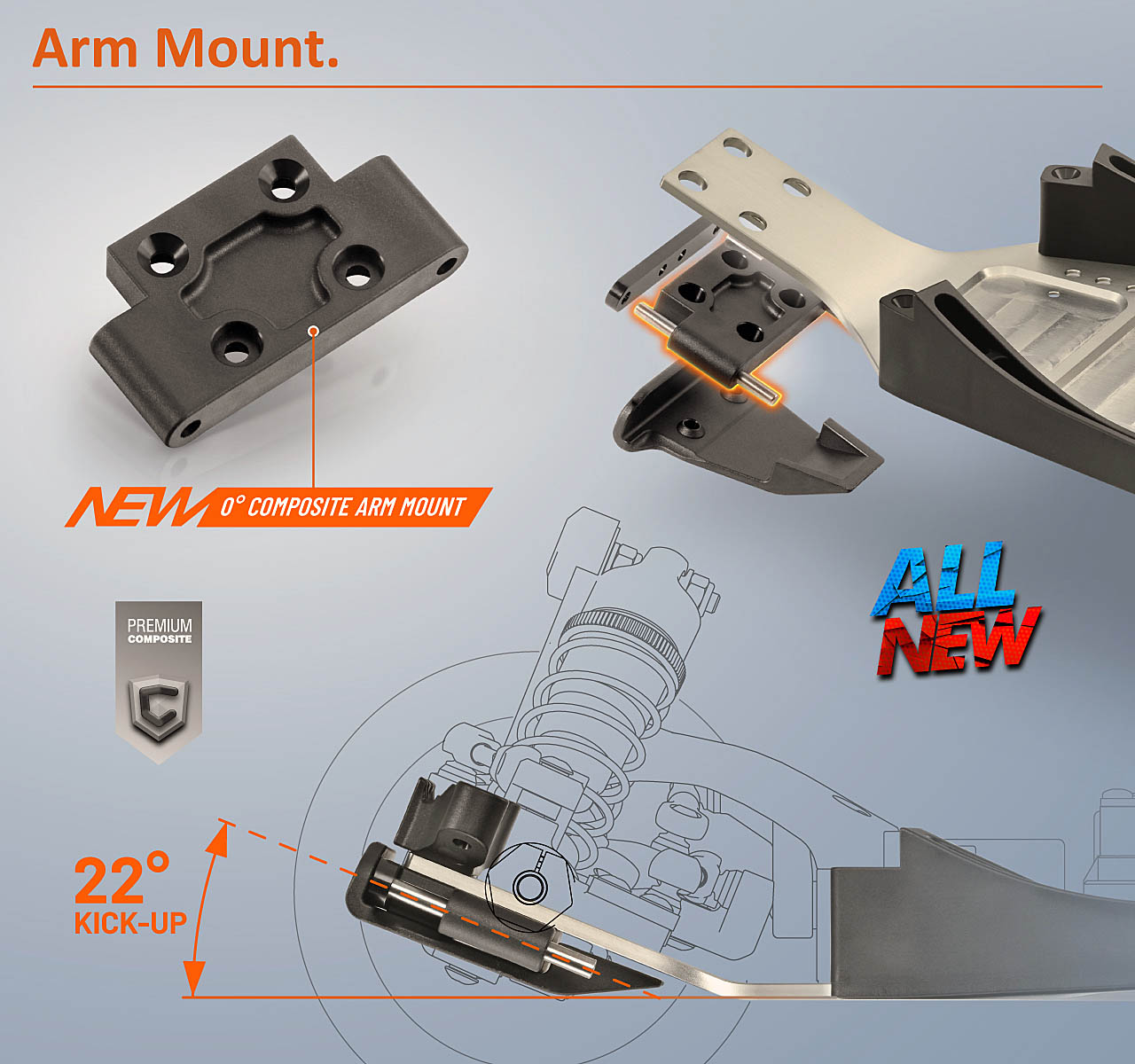 The XT2 continues to use an arm mount to connect the lower suspension arms to the chassis. The kit arm mount is 0° angle, keeping the front geometry matching the chassis' integrated kick-up.