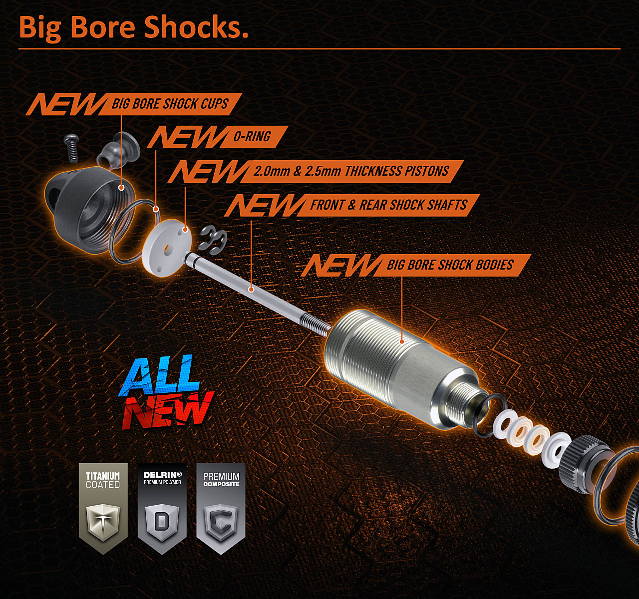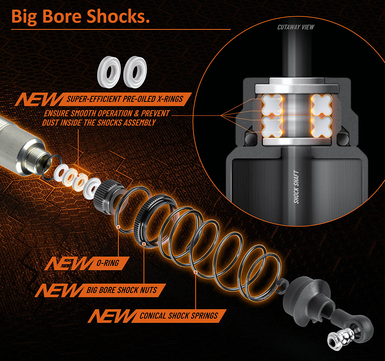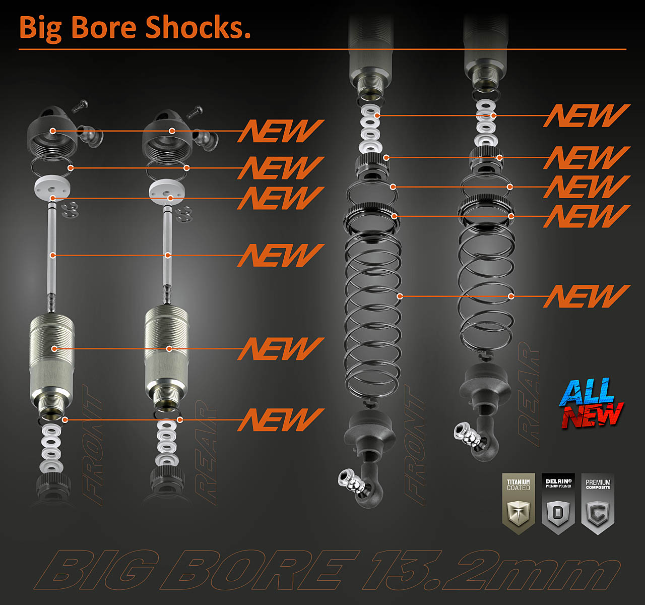 All-new big bore 13.2mm shocks improve handling, landing, and bump absorption. New X-rings provide smooth operation & dust resistance. Two different piston thicknesses are included in the kit for tuning along with piston blanks for additional tuning possibilities. A completely new set of conical springs are available for the big bore shocks.