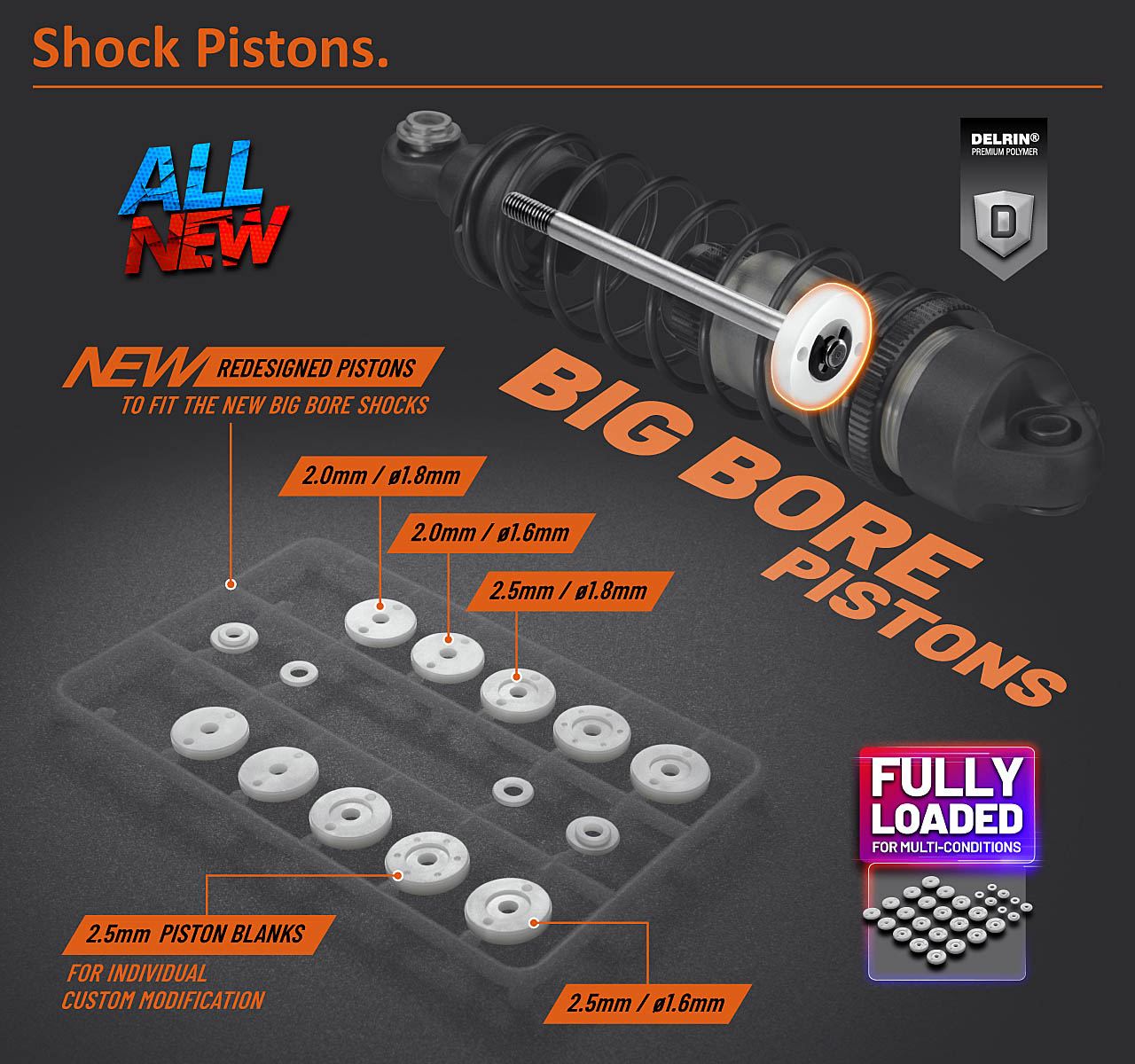 The new piston choices were updated for ideal fit and dampening in the new big bore shock bodies. All-new 2-hole pistons (1.6 and 1.8mm) are included in 2.0mm or 2.5mm thickness alternatives.