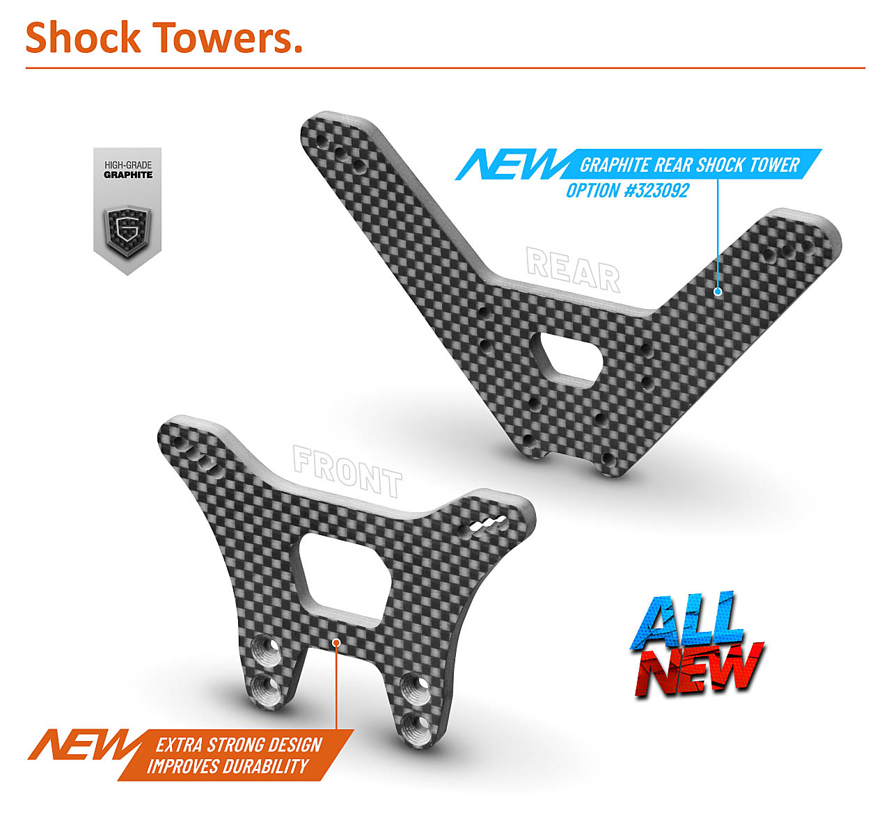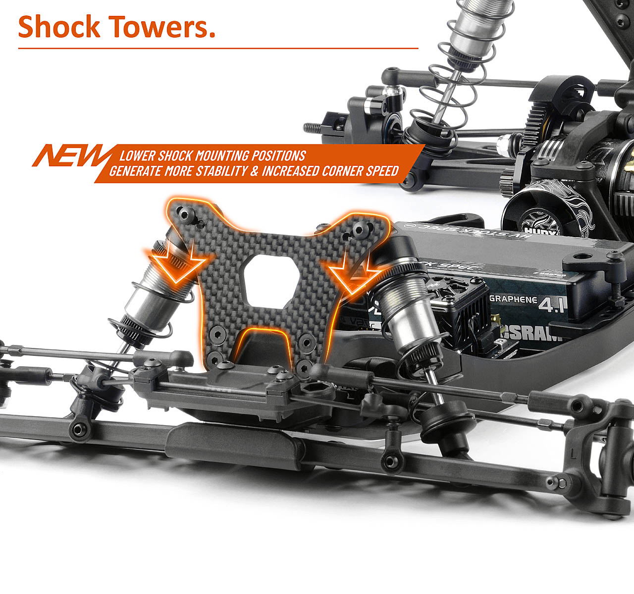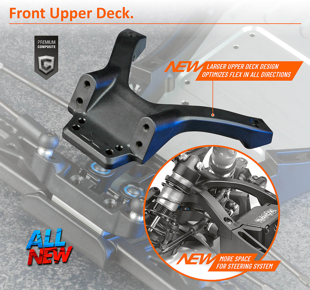 - The completely new front upper deck's bridge design integrates with the new steering system and moves the shock tower forward with the shocks behind the tower