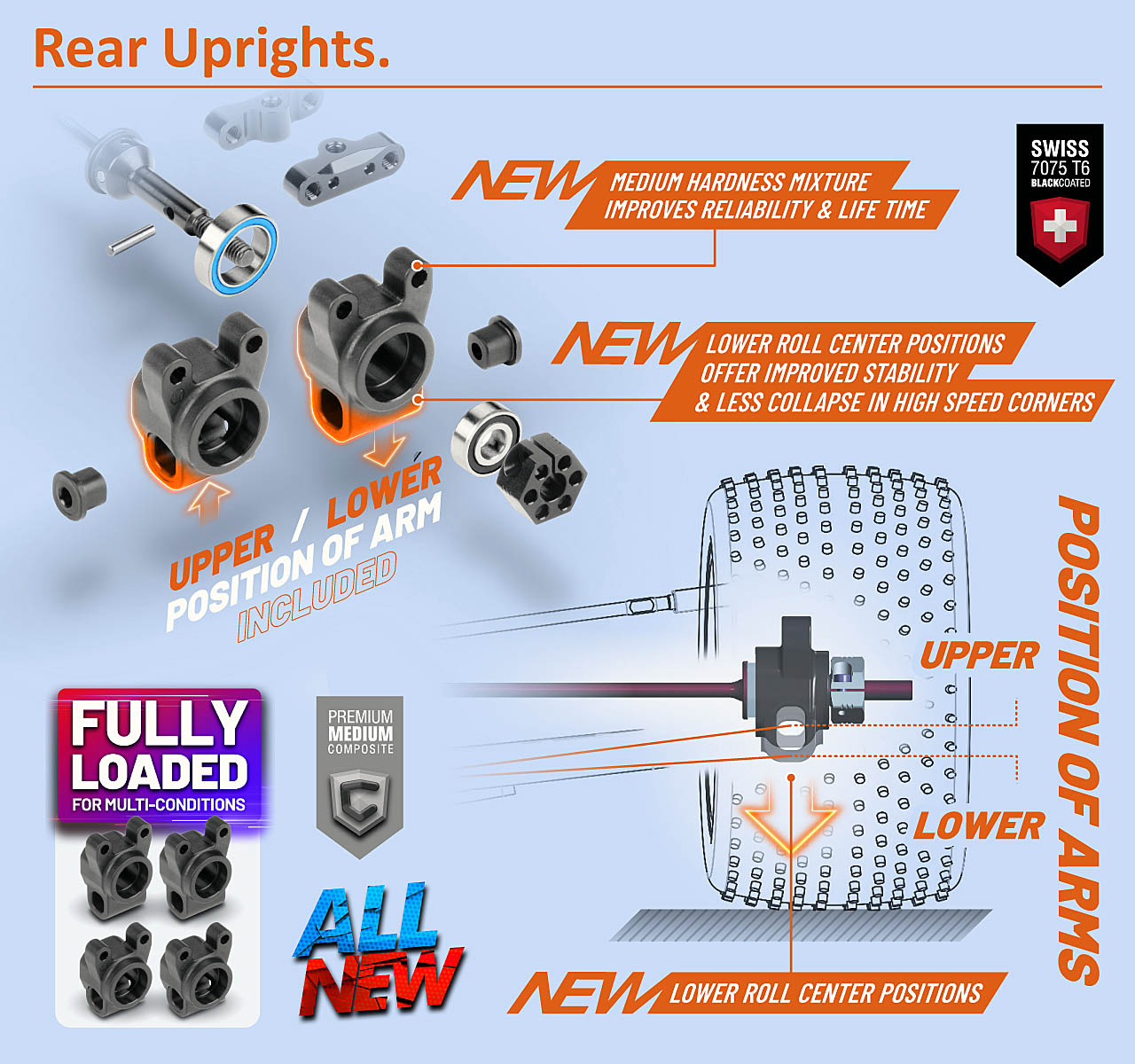 New rear uprights with lowered roll center positions improve stability with less collapse of the suspension in high-speed corners. Two different uprights are included in each kit for added set-up adjustments.