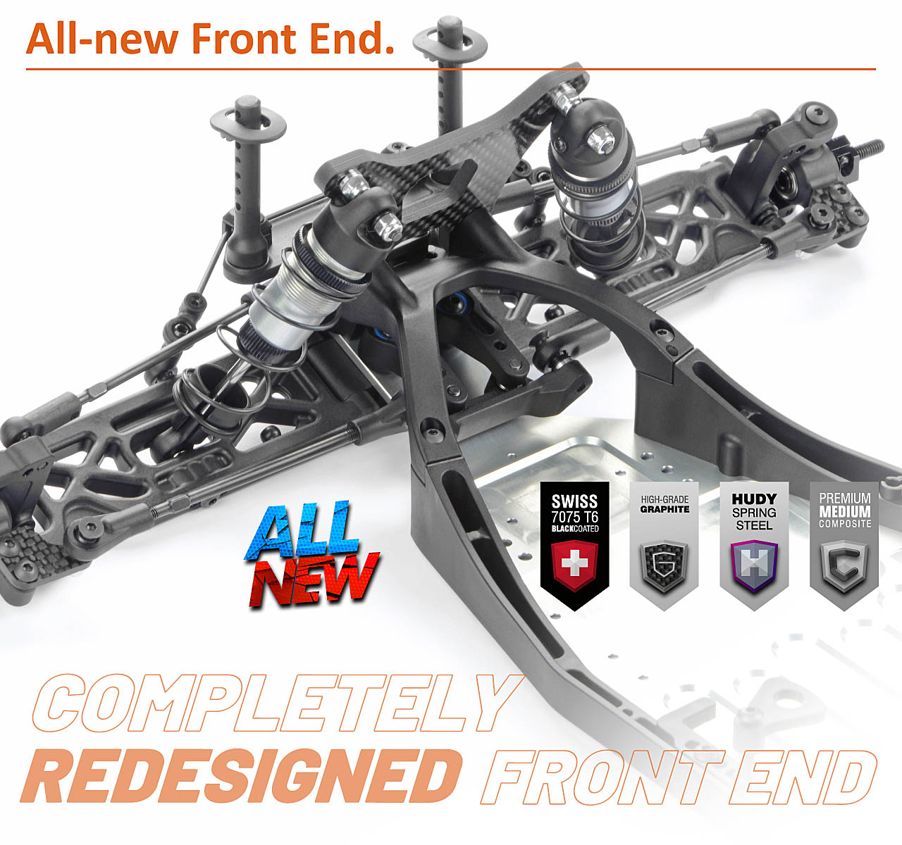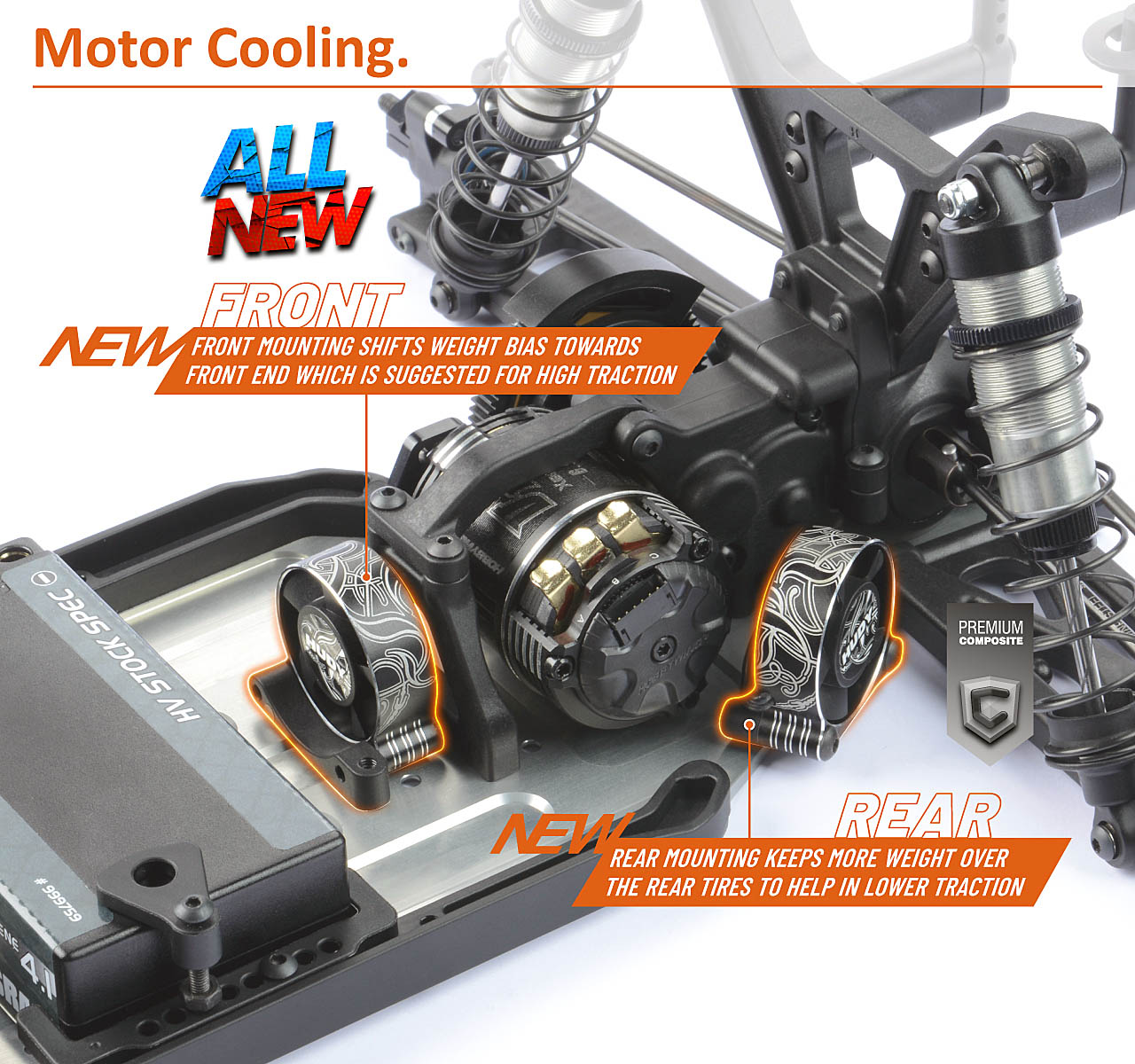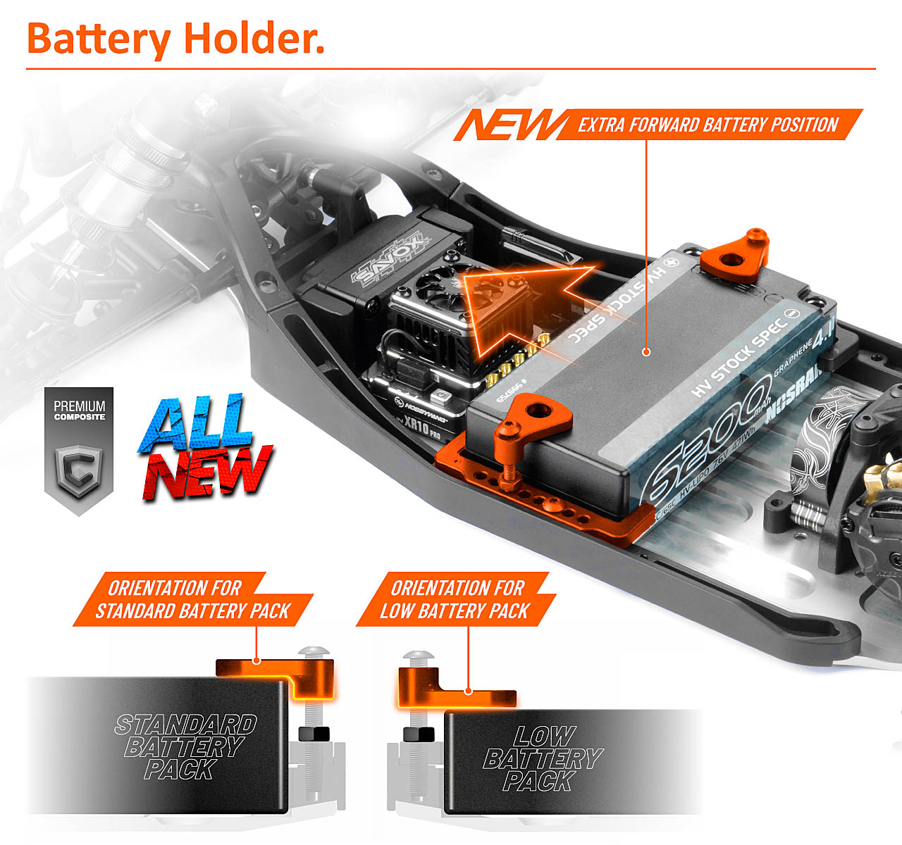 A new full forward battery mounting position is made possible by the new side braces. The additional tuning options for weight balance adjustments help to fine-tune set-ups for different track conditions.