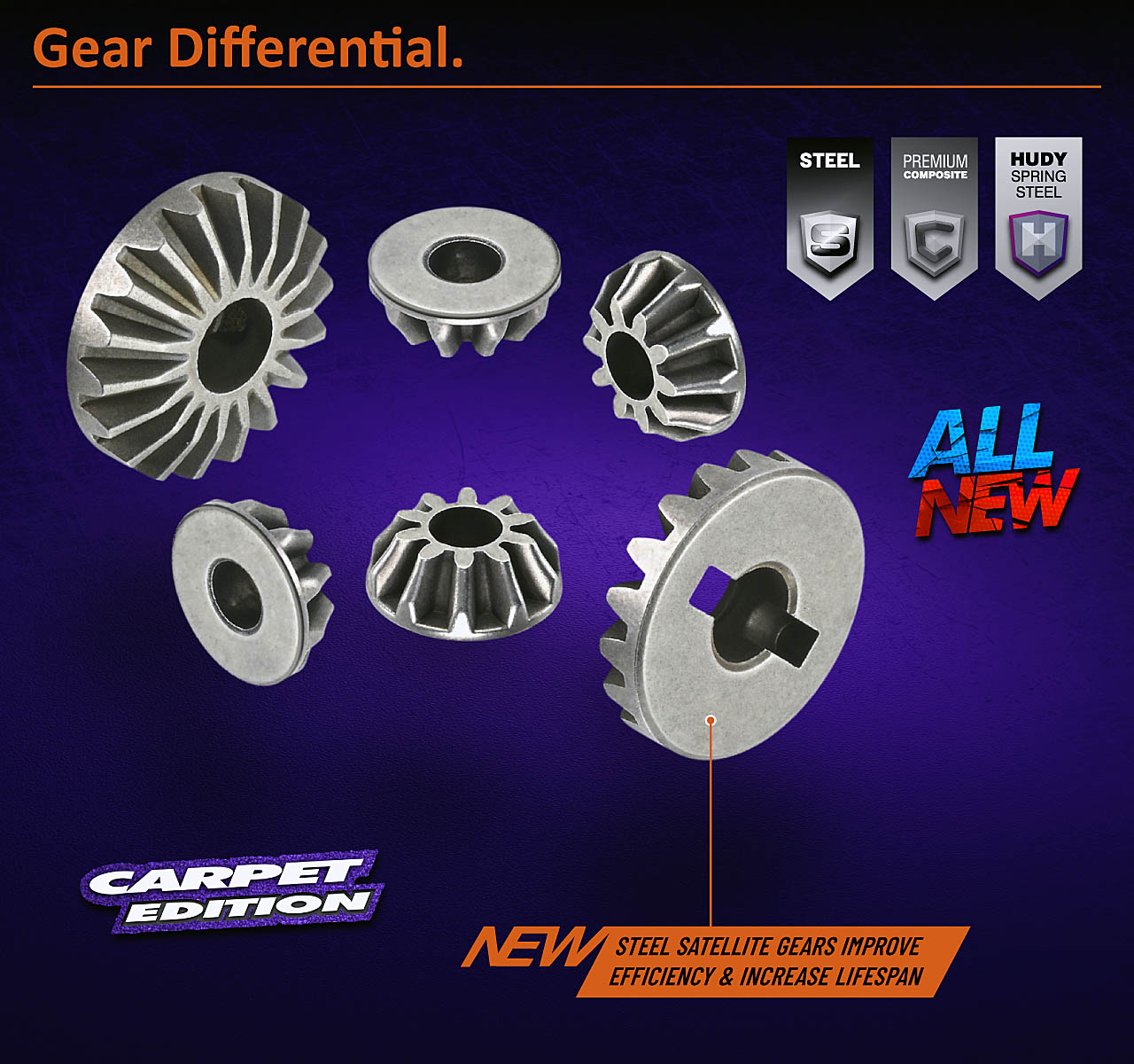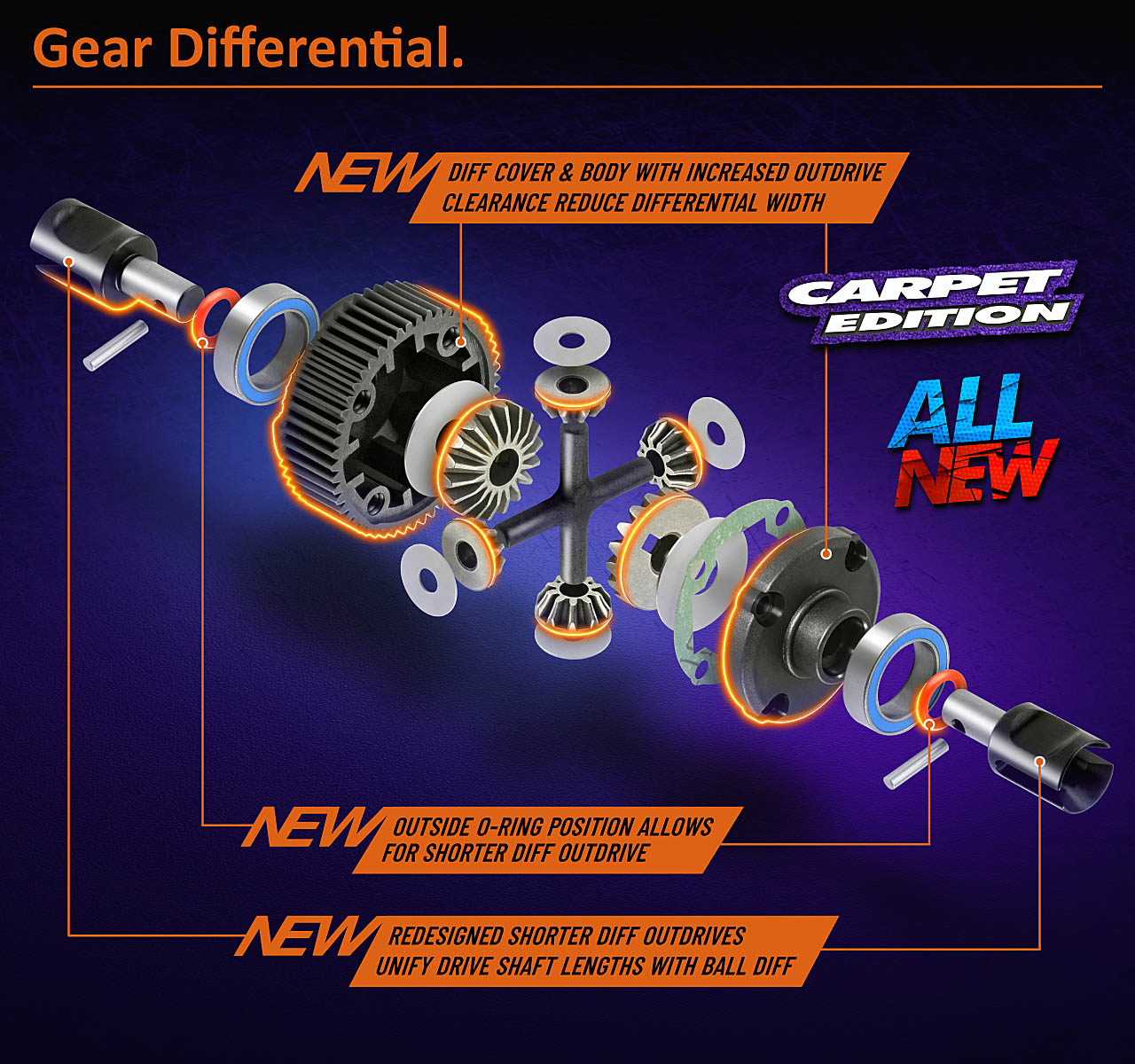 The Carpet Edition's redesigned gear diff made unified drive shaft lengths for ball and gear differentials possible. The external parts of the diff were updated to reduce the differential width. Steel gears are now included for maximum durability.