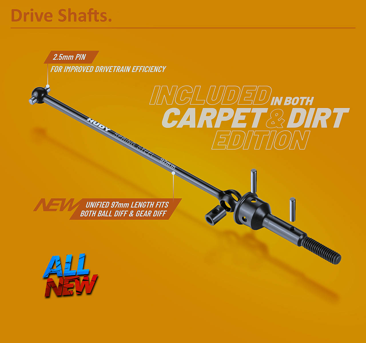 - The included 97mm driveshafts will work with both the ball diff and gear diff for simplified parts needs and easier differential changes between surfaces