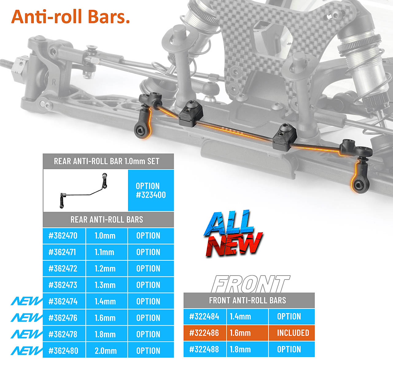 The kit comes with 1.6mm anti-roll bar, optional anti-roll bars for fine tuning are available.