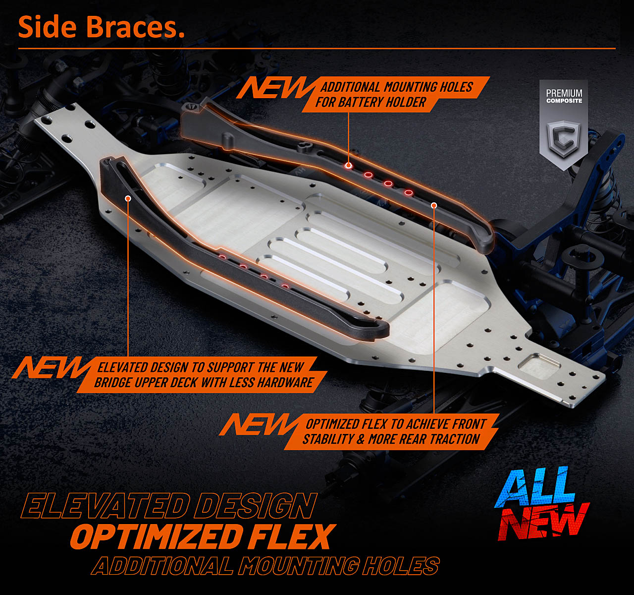 Redesigned side braces feature an elevated design to support the new one-piece chassis and connect directly with the new bridge upper deck. The new braces have improved flex to provide improved front stability while also increasing rear traction, and the additional battery holder mounting holes expand the weight balance adjustment range.