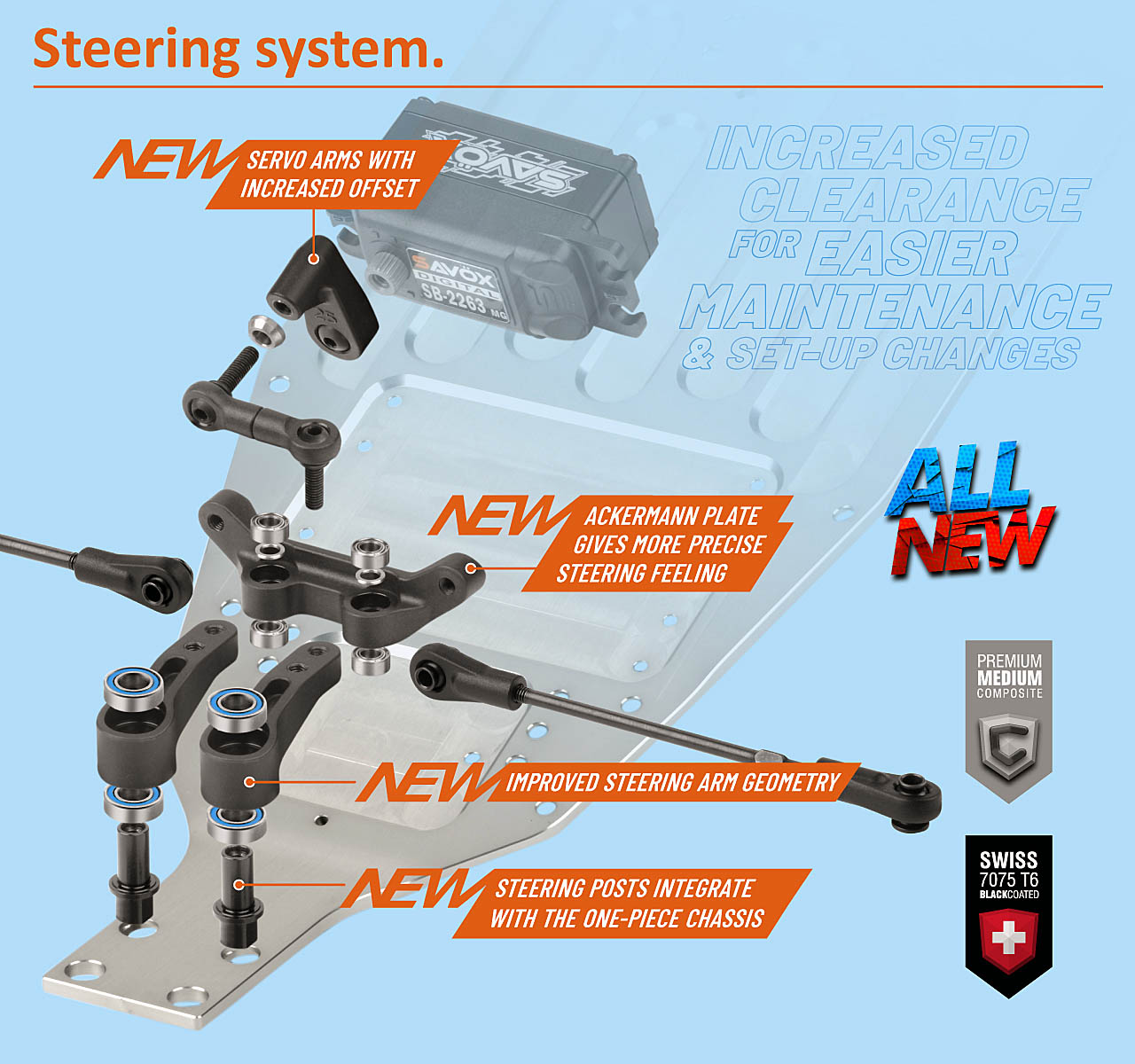 The new steering system improves precision and steering feel. There is also increased clearance around the system for easier maintenance & set-up adjustments.