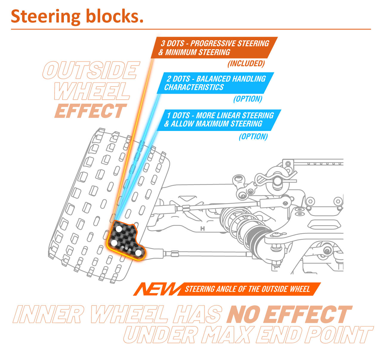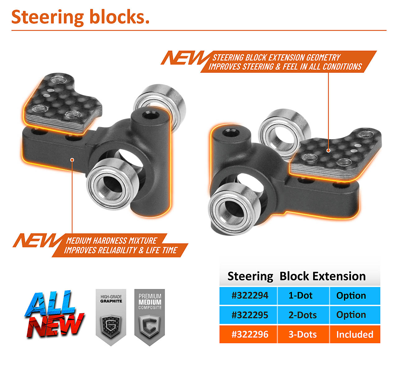 - New 2 dot steering extensions match the new steering system geometry, working together to improve the steering angles and responsiveness