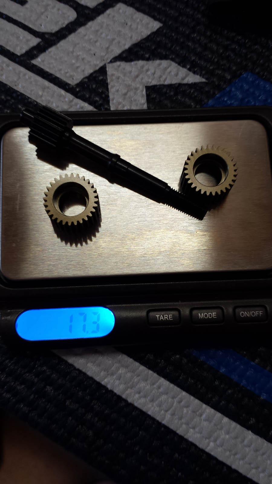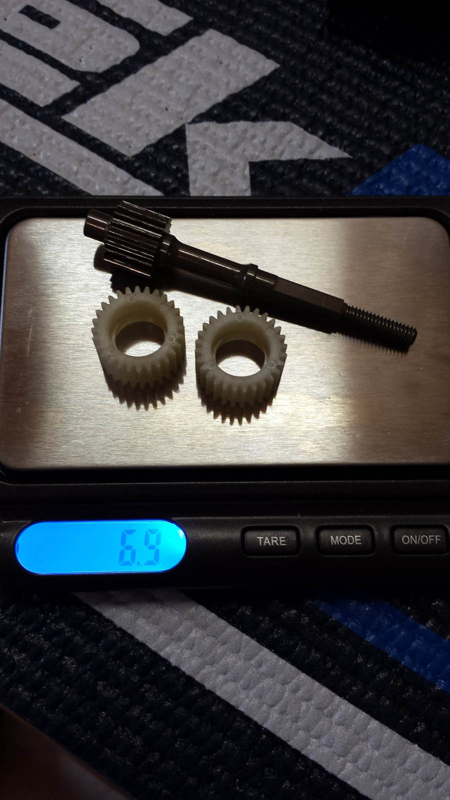 Next on the list was the optional aluminum top shaft kit and plastic transmission gears to replace the stock steel top shaft and aluminum idlers that come with the kit. Part # YOKB2-503I for the idler gears and YOKB2-303TA for the aluminum top shaft. These parts alone shave 10.4 grams!