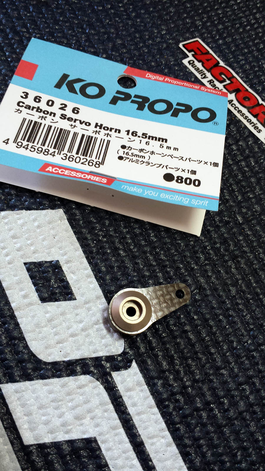 Now that the build is pretty much sorted mechanically. I’ve begun to install my electronics. One quick tip is to drill a small hole in the chassis side plate to allow your receiver wire to run through directly to the antenna boss. I used a 1.5mm drill bit. I also chose to upgrade the stock plastic servo horn with one of Ko Propo’s carbon fiber and aluminum servo horn kit. The 16.5mm kit fit perfectly and dropped right into place. I can’t tell you how cool this little piece is! They have multiple sizes sure to fit any car.