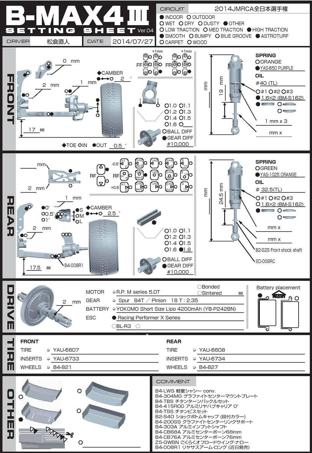 Options - B4-LWS - Light weight chassis conversion for B-MAX4III - B4-304MG - Center Mount Platet (Graphite) for B-MAX4III - B4-TBS - Titanium turn buckle set for B-MAX4III - B4-415R00 - Aluminum rear hub carrier (Toe-in 0°) for B-MAX4III - B4-TSS - Titanium Screw Set - B2-S4O - "X" Ver. II shock bottom cap (with stepped collor) for B-MAX2/4 - B4-200SS - Graphite center link support for B-MAX4III - B4-303A - - Aluminum input shaft for B-MAX4III - B4-CB68A - - Aluminum 68mm center bone for B-MAX4III - B4-CB76A - Aluminum 76mm center bone for B-MAX4III - ZS-GWBN - GOKURAKU Off-Road Wing (Narrow size) - B4-008R1 - Rear long suspension arm (to be release)
