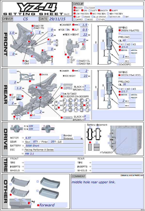 Here is the setup which i think will be a good starting point for dirt setup. this is stable and has good grip and easy to drive. the setup i ended with is very track specific with the shock combo i ran i very highly doubt will work on anything but that track...will be a good shock setup for carpet though